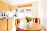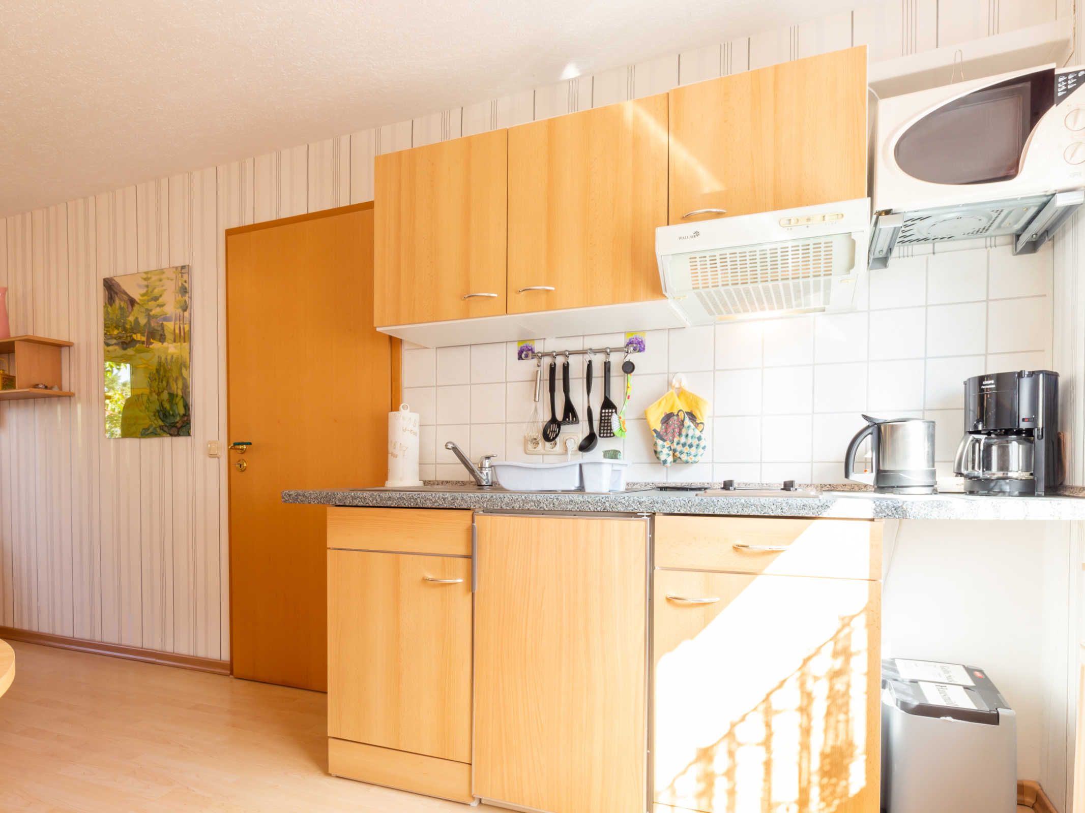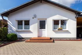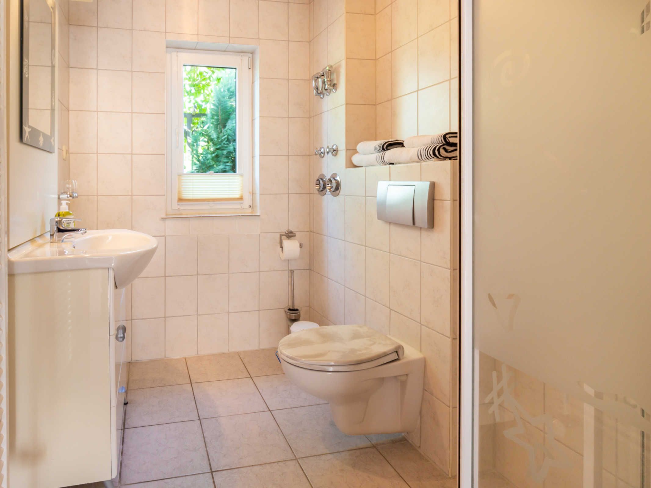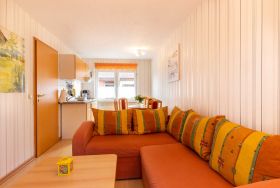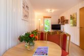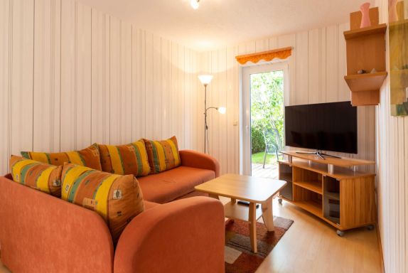 Die Unterkunft hat einen separaten Eingang. Vom Flur gelangen Sie in den offenen Wohn- und Essbereich mit Zugang zur Terrasse, in das Tageslichtbad sowie in das Schlafzimmer. Im Wohnbereich finden Sie eine gemütliche Sitzecke (Aufbettung auf der Couch für die 3. Person) und einen LCD-TV. Die Küchenzeile ist ausgestattet mit einem Kühlschrank, 2 Platten-Herd, einer Dunstabzugshaube, einer Mikrowelle, einer Kaffeemaschine und einem Wasserkocher. Ein separater Esstisch lädt zum Frühstücken ein. Das Schlafzimmer besitzt ein bequemes Doppelbett (durchgehende Matratze) sowie einen Kleiderschrank. Das Tageslichtbad mit Dusche und WC runden das geschmackvoll eingerichtete Ferienhaus ab. Die sonnige Terrasse mit Blick in den Garten befindet sich auf der Rückseite des Ferienhauses (Zugang vom Wohnraum). Ihr Auto können Sie auf der Zufahrt parken und Ihre Fahrräder finden unter dem Carport Ihren Platz.