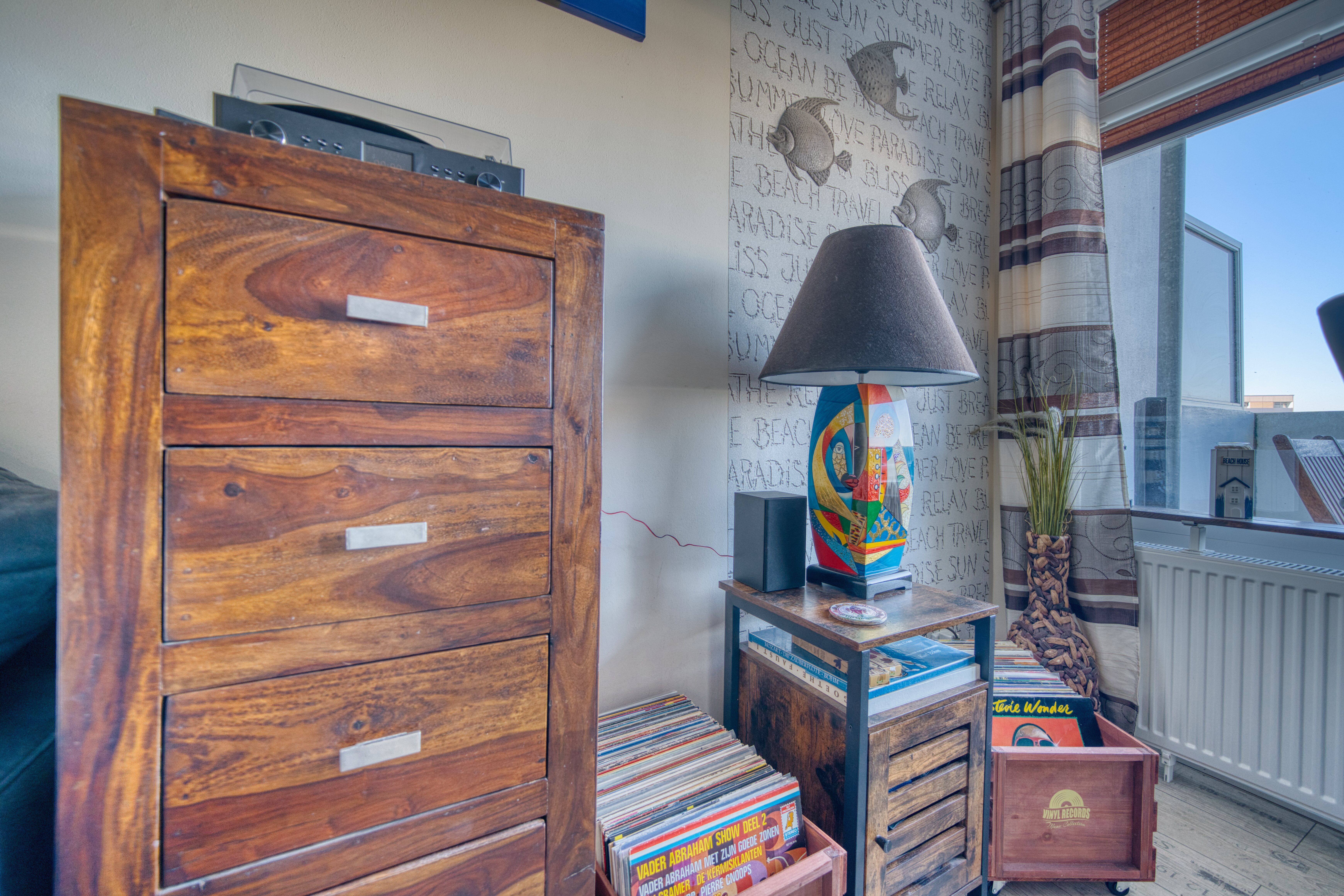 Unterhaltung: LCD-TV im Wohnzimmer, Plattenspieler und eine Auswahl an Schallplatten