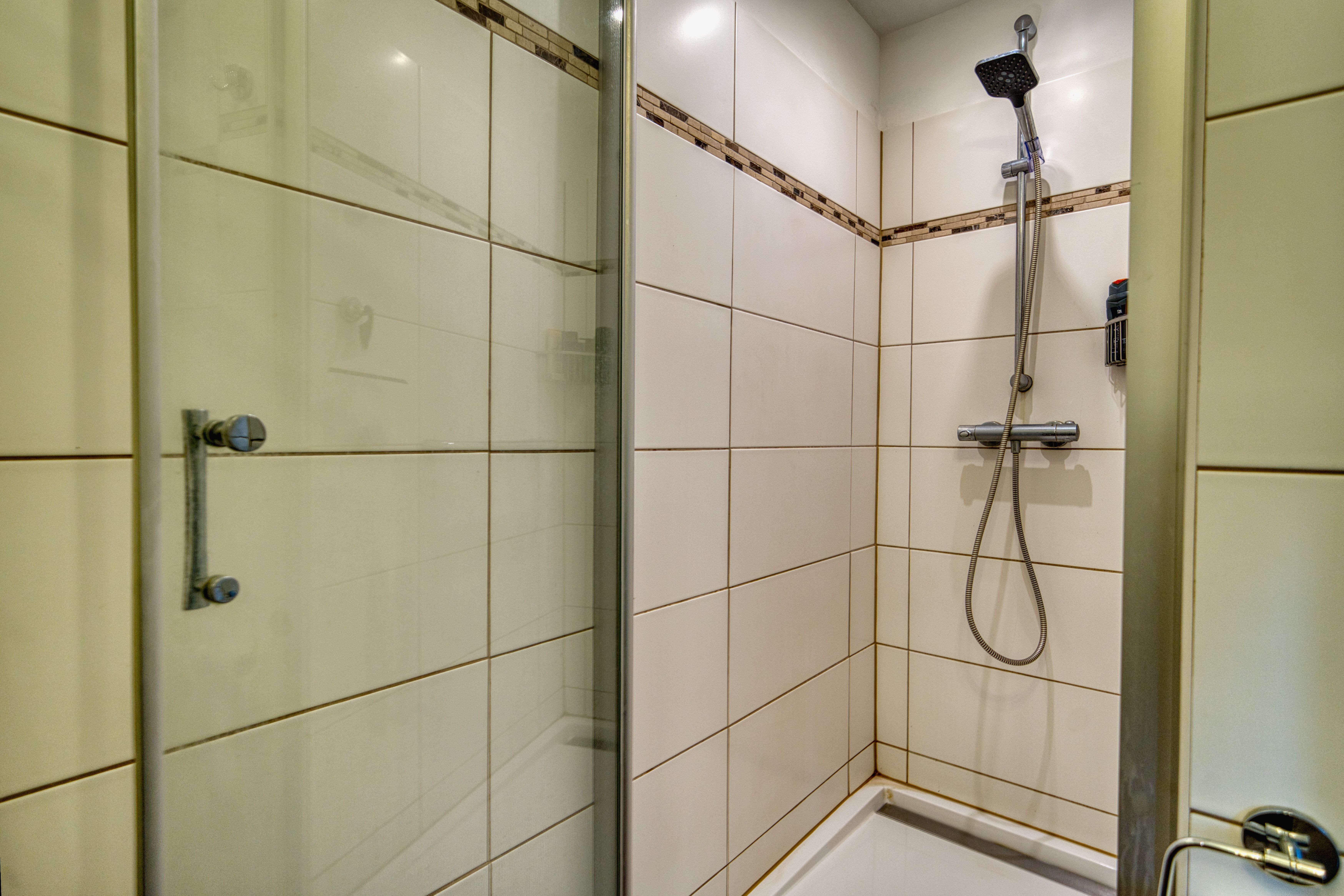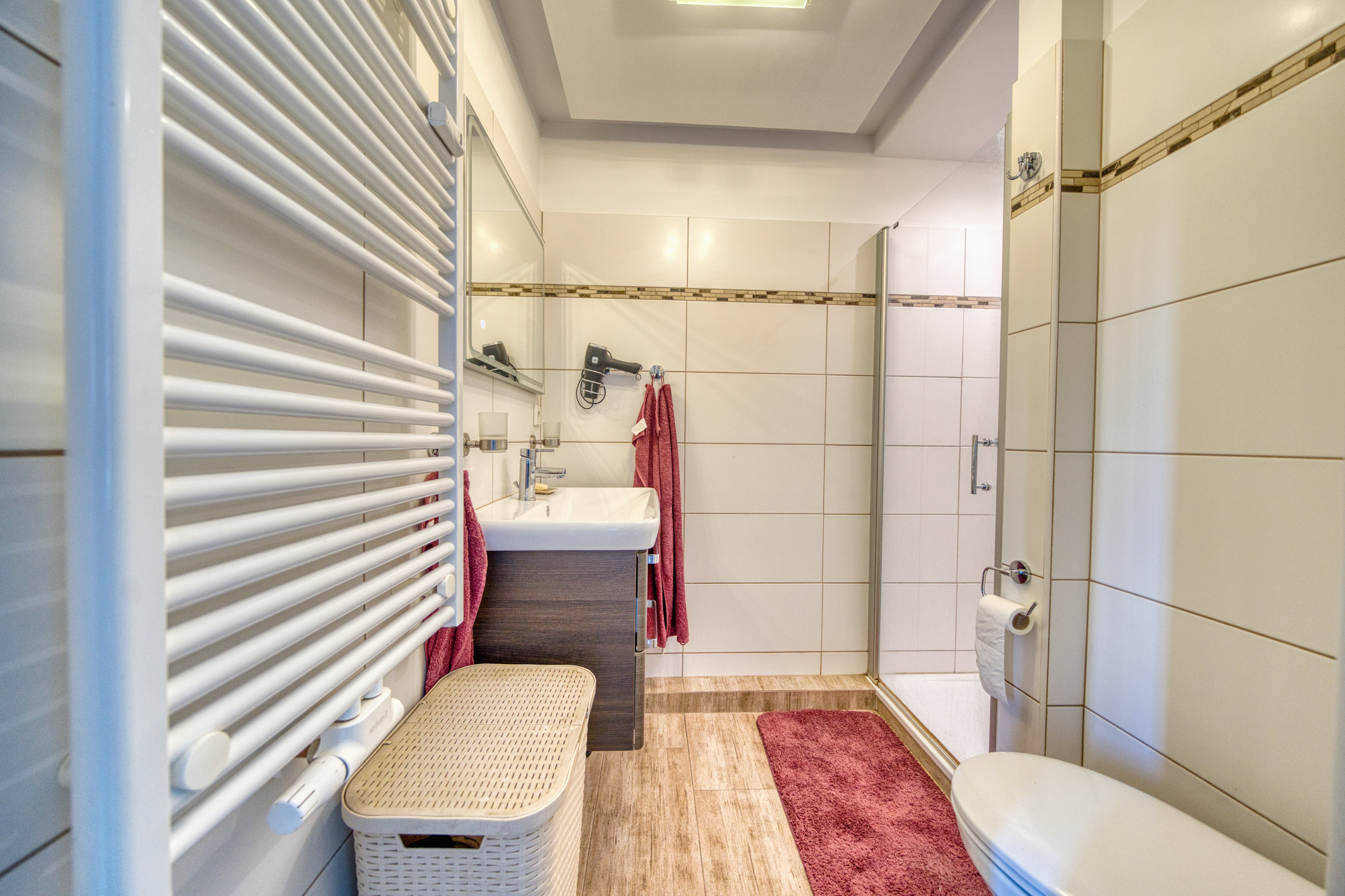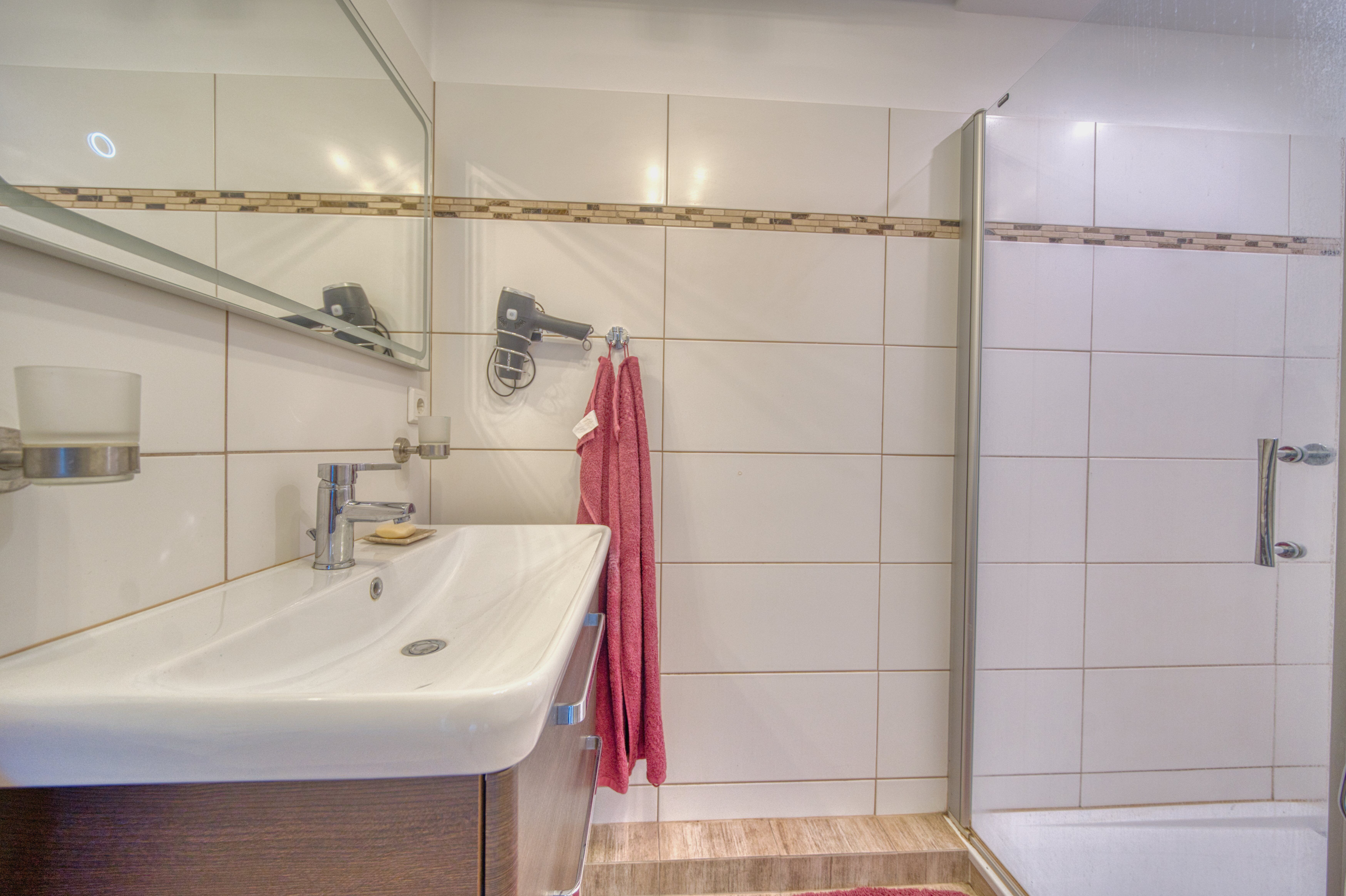 Badezimmer mit WC, Föhn und großzügiger Nischendusche (80 x 120 cm)