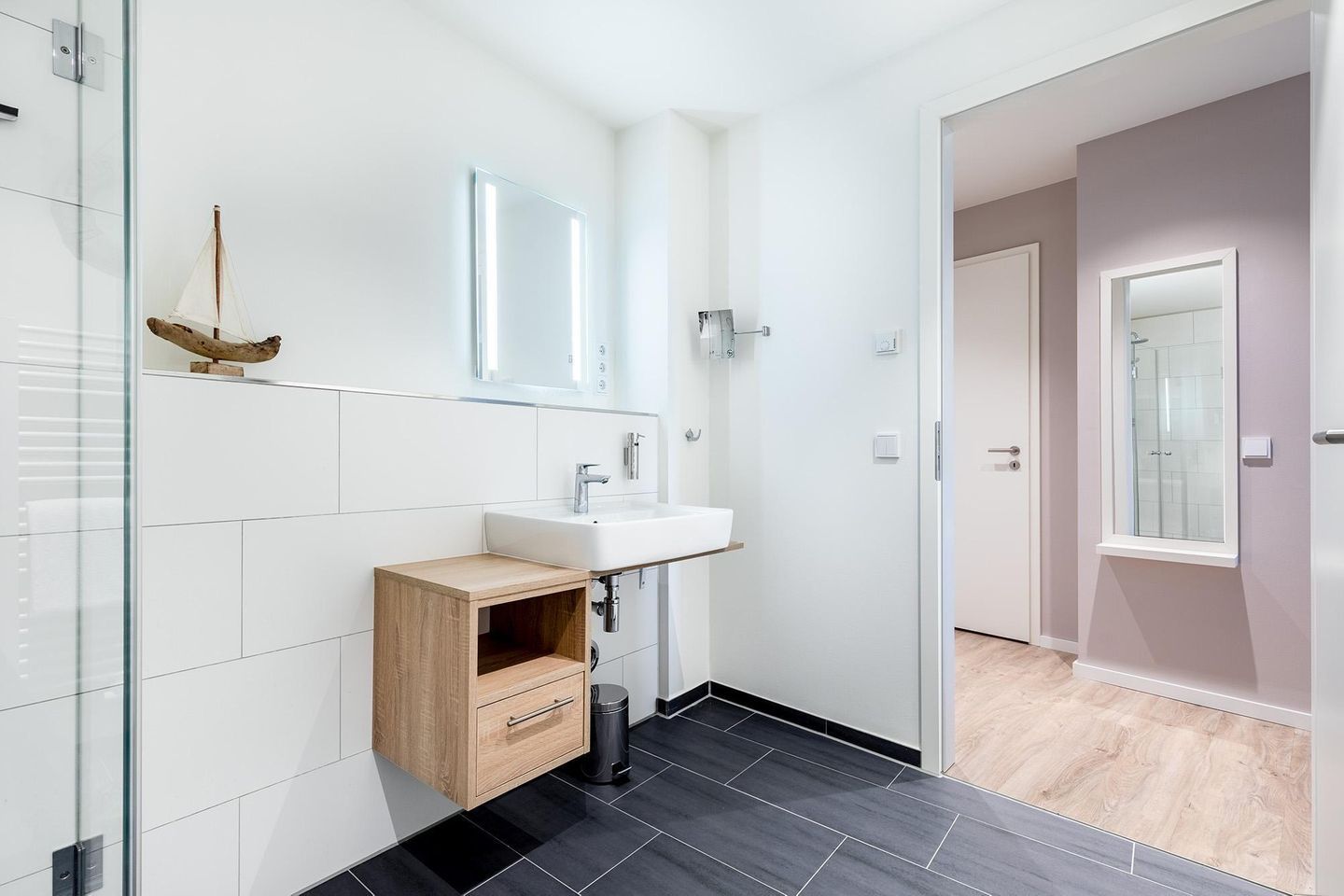 Das stilvoll gestaltete Bad ist mit einer ebenerdigen Dusche, einem Kosmetikspiegel, Föhn, Handtuchheizkörper und – wie das gesamte Apartment – mit wohliger Fußbodenheizung ausgestattet. Ein Wäscheständer ist ebenfalls vorhanden. Einen Hund dürfen Sie gerne mitbringen.