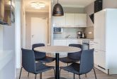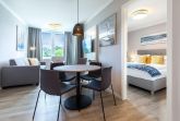 Das lichtdurchflutete Apartment verfügt über eine offene, voll ausgestattete Küche mit Geschirrspüler, Kühlschrank mit Gefrierfach, Mikrowelle, Kaffeemaschine, Toaster, Wasserkocher, Eierkocher, Cerankochfeld und Backofen. Der behagliche Wohn-Essbereich lädt zum Entspannen ein und ist mit einer komfortablen Doppelschlafcouch sowie einem SMART-TV ausgestattet.