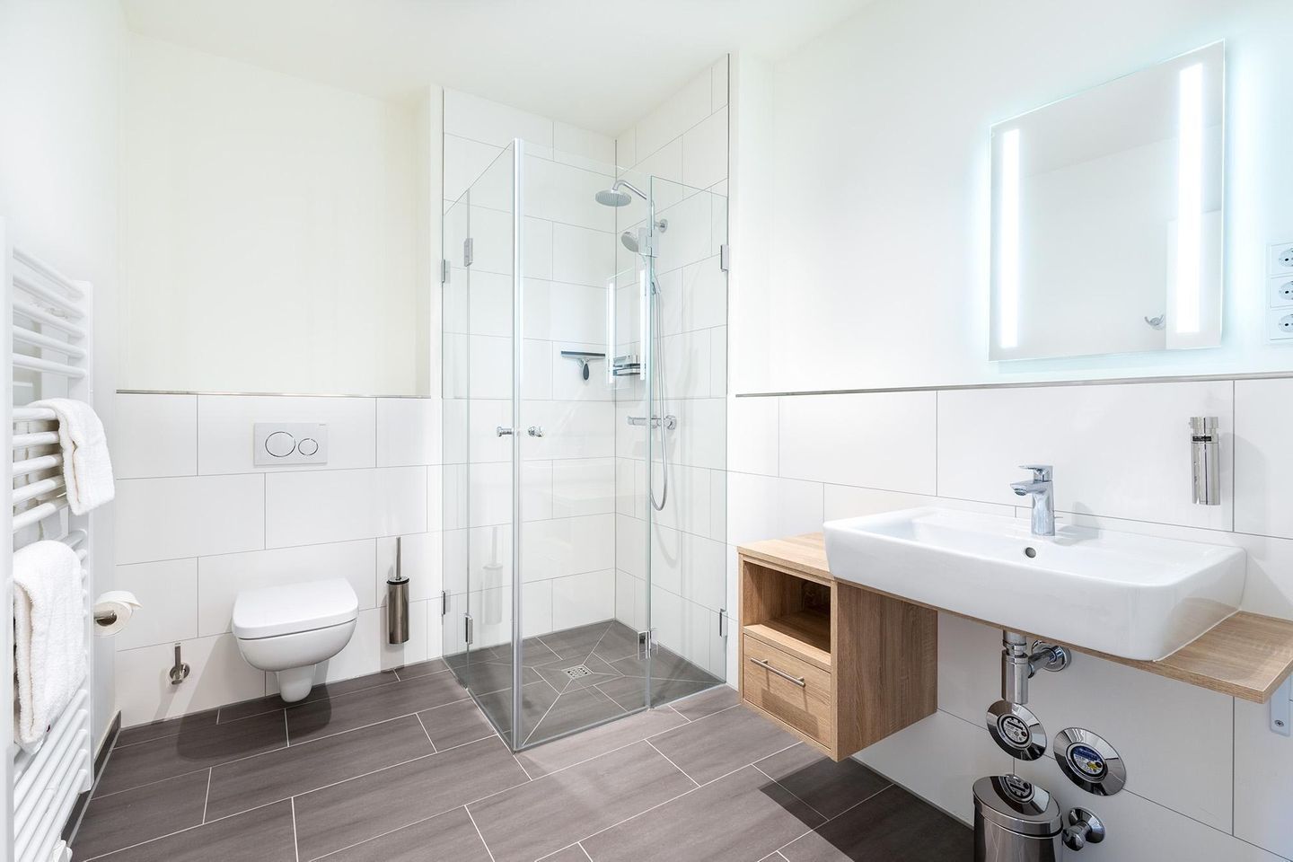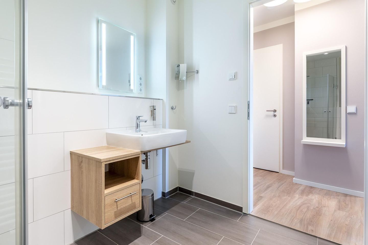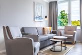 Zur Ausstattung der Ferienanlage gehören außerdem eine Rezeption mit Lobby und Kamin-Lounge, eine Tiefgarage mit inkludiertem Stellplatz (max. Höhe 2 m) sowie gemeinschaftlich nutzbare Waschräume auf jeder Etage. Zwei Aufzüge sorgen für barrierefreien Zugang zu allen Apartments. Fahrräder lassen sich sicher im abschließbaren Kellerraum unterbringen, und vor dem Haus steht eine öffentliche Ladestation für E-Autos zur Verfügung, die gegen Gebühr genutzt werden kann.