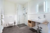 Das stilvolle Badezimmer ist mit einer ebenerdigen Dusche, einem eleganten Waschtisch, Handtuchheizkörper, Föhn und ebenfalls Fußbodenheizung ausgestattet – für ein rundum angenehmes Wohngefühl.
