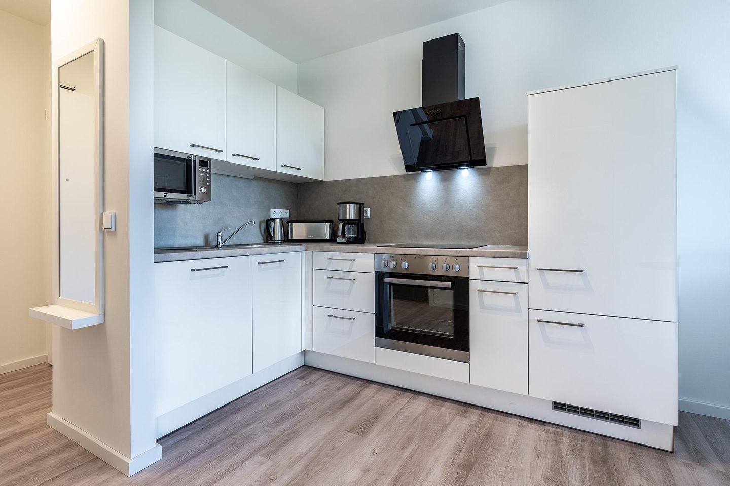 Zur Ausstattung der Ferienanlage gehören außerdem eine Rezeption mit Lobby und Kamin-Lounge, eine Tiefgarage mit inkludiertem Stellplatz (max. Höhe 2 m) sowie gemeinschaftlich nutzbare Waschräume auf jeder Etage. Zwei Aufzüge sorgen für barrierefreien Zugang zu allen Apartments. Fahrräder lassen sich sicher im abschließbaren Kellerraum unterbringen, und vor dem Haus steht eine öffentliche Ladestation für E-Autos zur Verfügung, die gegen Gebühr genutzt werden kann.