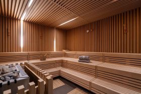 Ein besonderes Highlight ist die großzügige Wellnesslandschaft: Finnische Sauna, Biosauna, Dampfbad, Fußbäder, Erlebnisduschen, Eisbrunnen sowie Ruhezonen mit Kamin laden zum Entspannen ein. Während der Öffnungszeiten steht euch der Spa-Bereich kostenfrei zur Verfügung. Wer keinen Bademantel dabei hat, kann sich diesen ebenso wie Saunatücher bequem gegen eine geringe Gebühr leihen. Ein Aufzug verbindet den Wellnessbereich mit allen Etagen, sodass Sie bequem zu Ihrer Wohnung gelangen können.