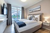 Zur Ausstattung der Ferienanlage gehören außerdem eine Rezeption mit Lobby und Kamin-Lounge, eine Tiefgarage mit inkludiertem Stellplatz (max. Höhe 2 m) sowie gemeinschaftlich nutzbare Waschräume auf jeder Etage. Zwei Aufzüge sorgen für barrierefreien Zugang zu allen Apartments. Fahrräder lassen sich sicher im abschließbaren Kellerraum unterbringen, und vor dem Haus steht eine öffentliche Ladestation für E-Autos zur Verfügung, die gegen Gebühr genutzt werden kann.