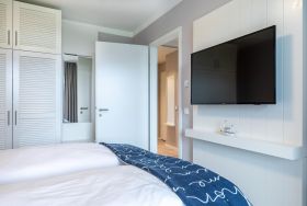 Im separaten Schlafzimmer erwartet Sie ein modernes Boxspringbett, das Ihnen erholsamen Schlaf garantiert. Auch hier steht Ihnen ein weiterer Flatscreen-TV zur Verfügung.