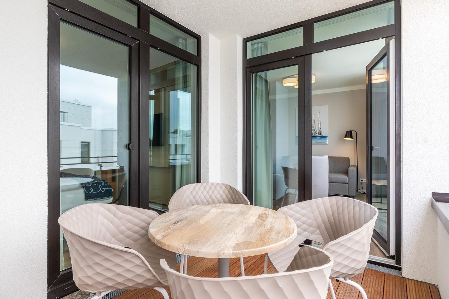 Ein echtes Highlight ist die überdachte Loggia in sonniger Süd-West-Lage, die Ihnen von morgens bis abends zahlreiche Sonnenstunden beschert. Ob beim Frühstück mit Blick ins Grüne, einem Kaffee am Nachmittag oder einem Glas Wein am Abend – hier genießen Sie das gesunde Meeresklima der Ostsee in vollen Zügen. Die Loggia ist sowohl vom Wohnbereich als auch vom Schlafzimmer aus begehbar und mit komfortablen Gartenmöbeln ausgestattet – ideal für Ihre persönliche Auszeit an der frischen Luft.