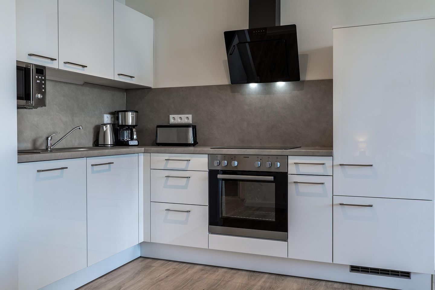 Die offen gestaltete Küche ist voll ausgestattet und lässt keine Wünsche offen: Neben Geschirrspüler, Kühl-Gefrierkombination, Kaffeemaschine, Eierkocher, Toaster, Wasserkocher und Mikrowelle stehen Ihnen ein Herd mit Glaskeramikkochfeld sowie ein Backofen zur Verfügung – ideal für alle, die auch im Urlaub gerne selbst kochen.