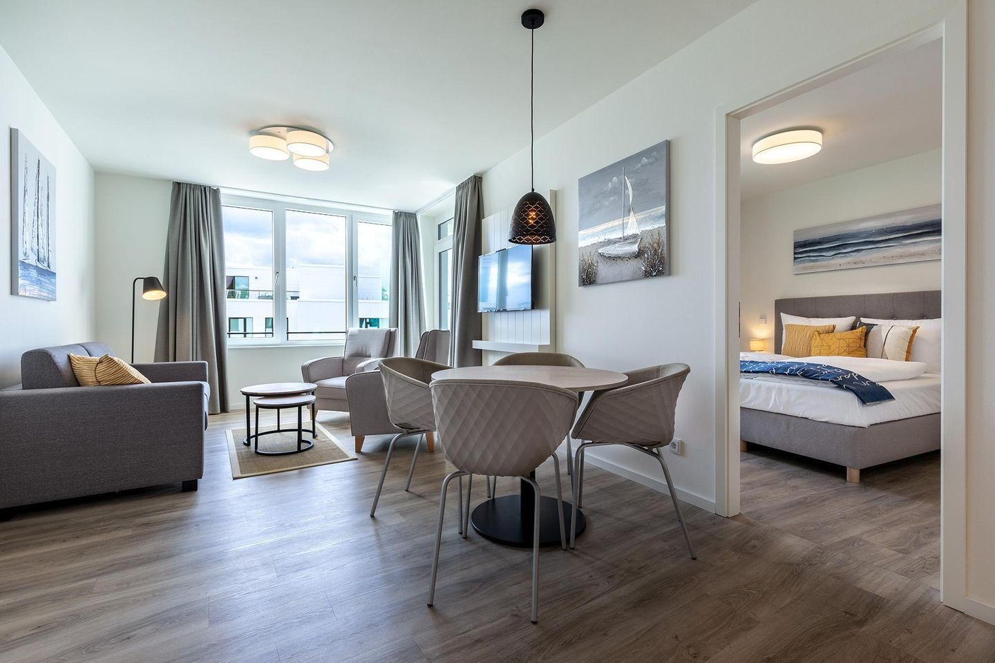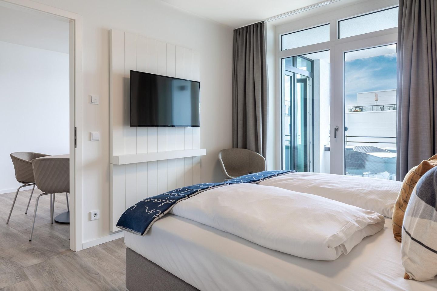 Das Apartment überzeugt durch seine helle, moderne Gestaltung und eine hochwertige Ausstattung. Fußbodenheizung, sonnenschutzverglaste, teilweise bodentiefe Fenster sowie kostenfreies WLAN sorgen für Komfort zu jeder Jahreszeit.
