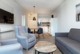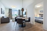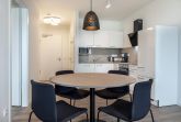 Im Inneren erwartet Sie ein hochwertig ausgestattetes Nichtraucher-Apartment mit durchdachtem Komfort. Dank der Fußbodenheizung und der sonnenschutzverglasten, teilweise bodentiefen Fenster genießen Sie zu jeder Jahreszeit ein angenehmes Wohnklima. Der offen gestaltete Wohn-Essbereich lädt mit einer bequemen Doppelschlafcouch und einem großen Flatscreen-TV zum Verweilen ein – ideal für gemeinsame Abende in gemütlicher Atmosphäre.