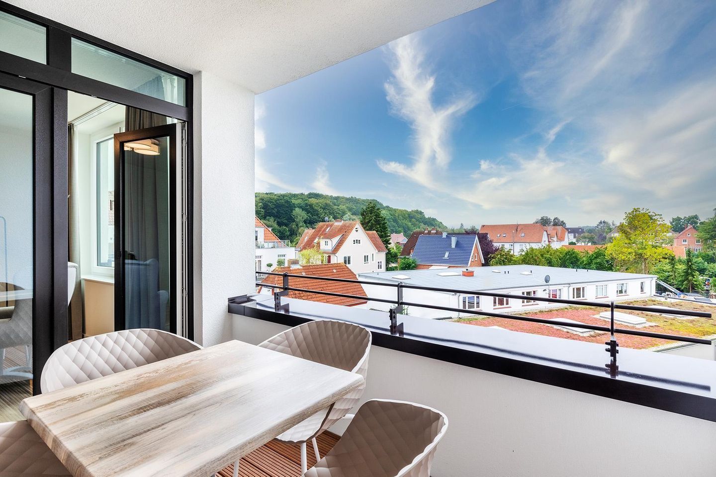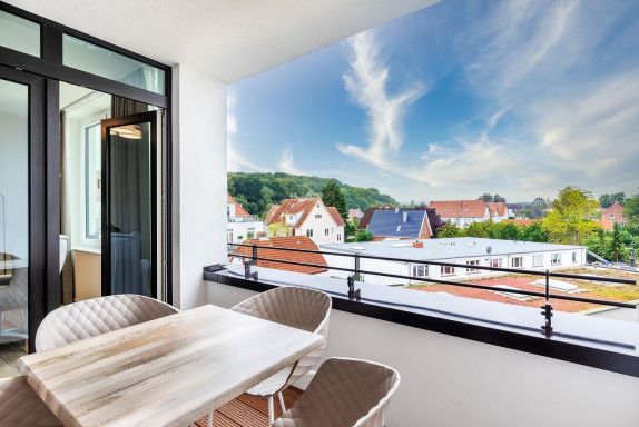 Ein besonderes Highlight ist die überdachte Loggia in sonniger Südwest-Lage: Von den ersten Sonnenstrahlen am späten Vormittag bis hin zum goldenen Licht des Abends lässt sich hier das milde Ostseeklima in vollen Zügen genießen. Die Loggia ist sowohl vom Wohnzimmer als auch vom Schlafzimmer aus zugänglich und mit stilvollen Gartenmöbeln ausgestattet – perfekt für entspannte Stunden bei einem guten Buch, einem Glas Wein oder einem Frühstück an der frischen Meeresluft.