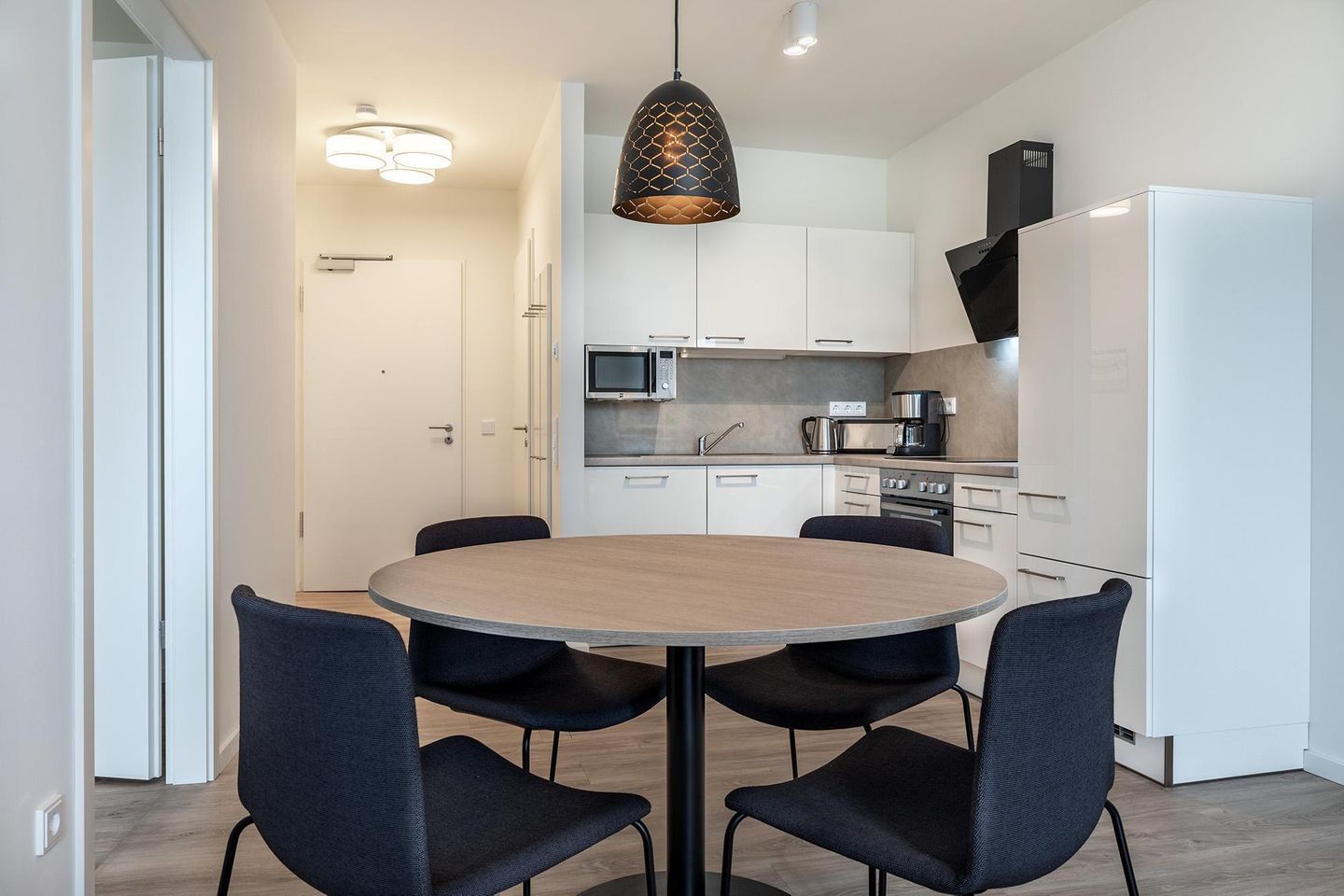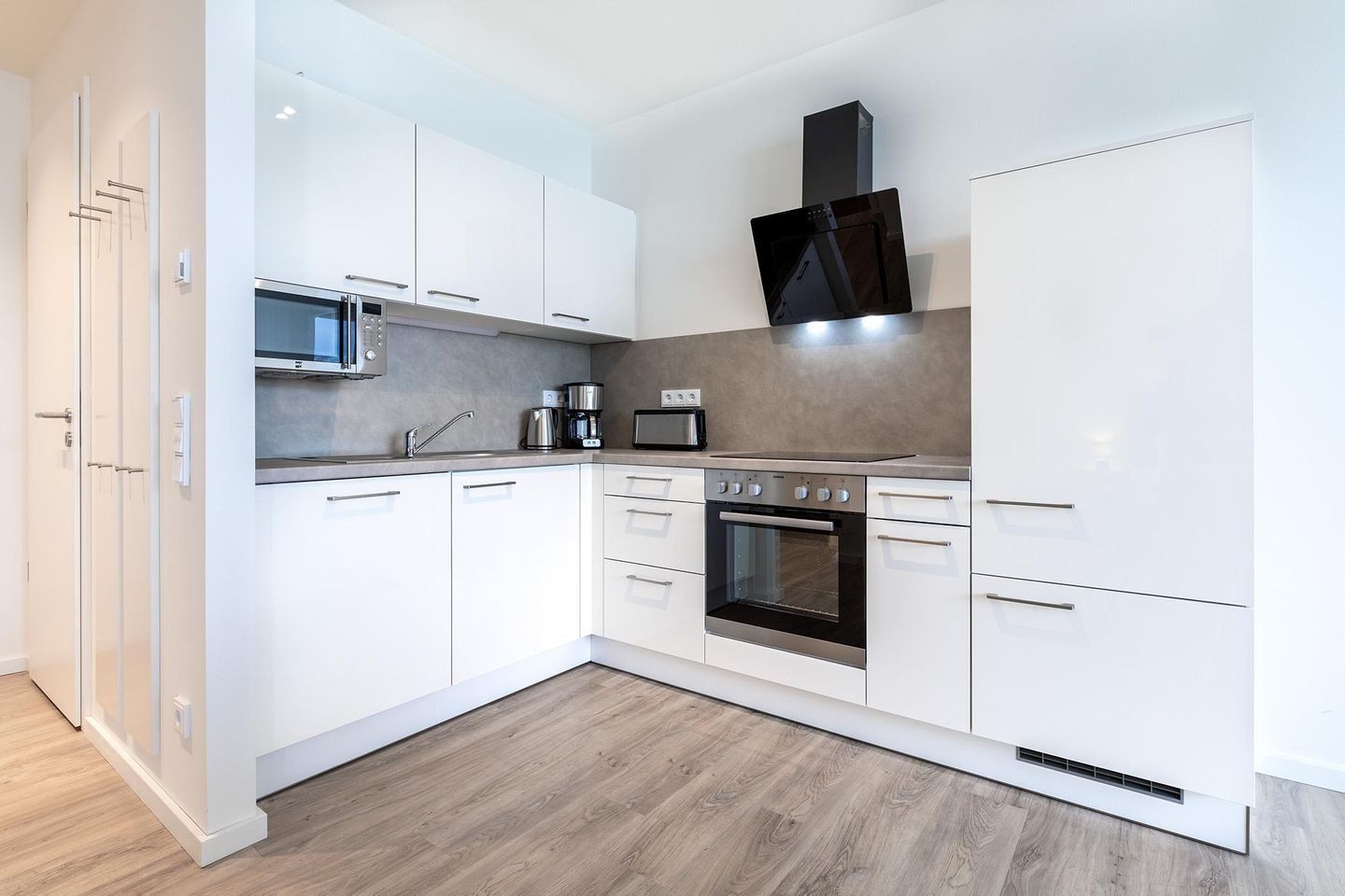 Die voll ausgestattete Küche lässt keine Wünsche offen: Ob Frühstück oder Abendessen – hier finden Sie alles, was Sie brauchen – von Kaffeemaschine, Toaster und Wasserkocher bis hin zu Geschirrspüler, Mikrowelle, Backofen, Glaskeramikkochfeld und einer praktischen Kühl-Gefrierkombination.