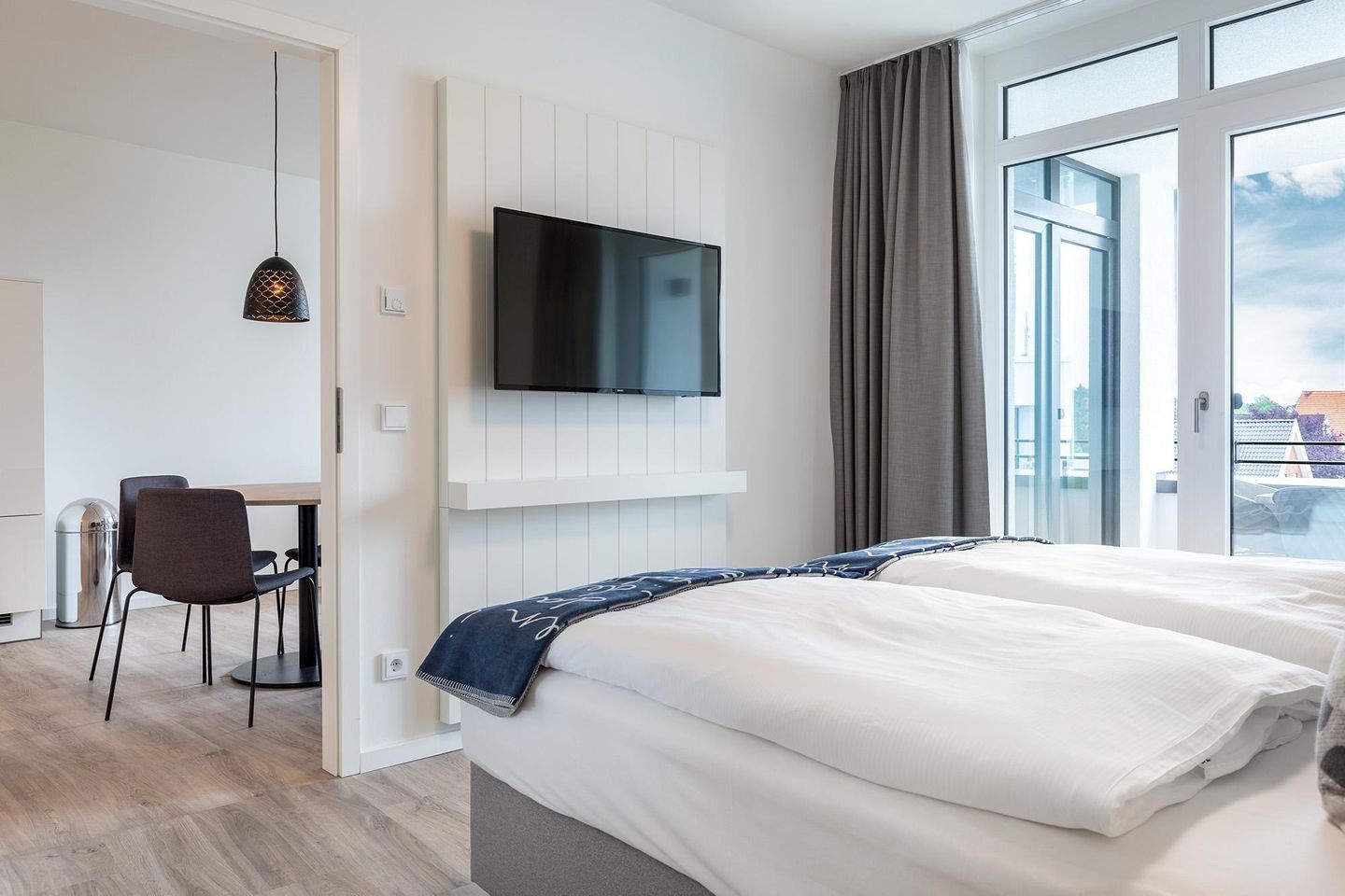 Im separaten Schlafzimmer sorgt ein großzügiges Boxspringbett für erholsame Nächte. Auch hier steht Ihnen ein Flatscreen-TV zur Verfügung – für gemütliche Stunden im Bett nach einem erlebnisreichen Urlaubstag.