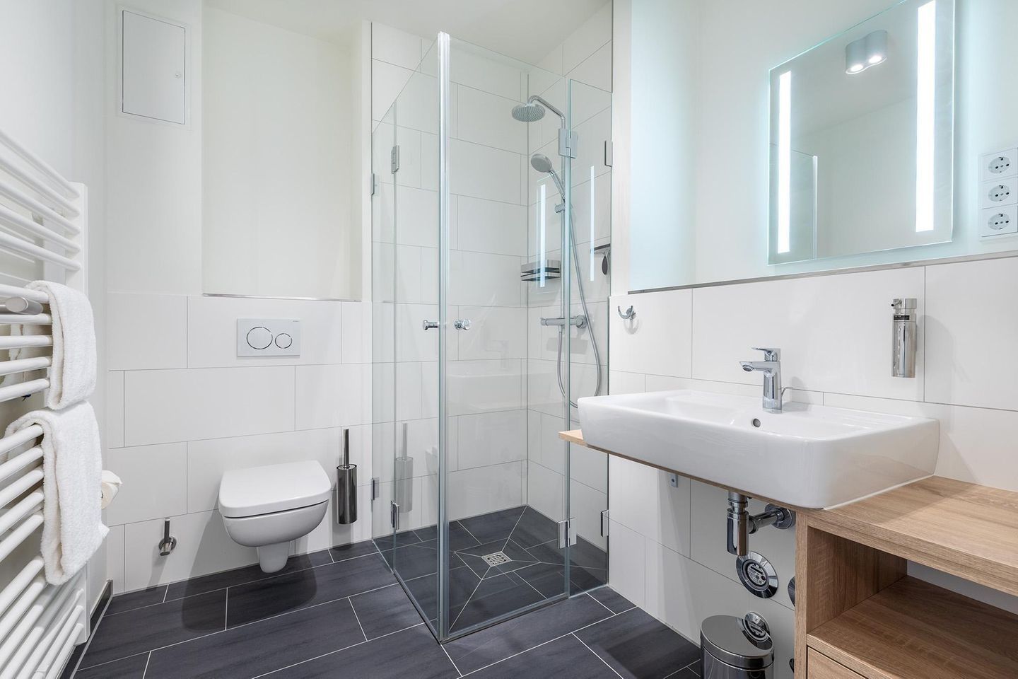 Ein besonderes Highlight ist die großzügige Wellnesslandschaft: Finnische Sauna, Biosauna, Dampfbad, Fußbäder, Erlebnisduschen, Eisbrunnen sowie Ruhezonen mit Kamin laden zum Entspannen ein. Während der Öffnungszeiten steht euch der Spa-Bereich kostenfrei zur Verfügung. Wer keinen Bademantel dabei hat, kann sich diesen ebenso wie Saunatücher bequem gegen eine geringe Gebühr leihen. Ein Aufzug verbindet den Wellnessbereich mit allen Etagen, sodass Sie bequem zu Ihrer Wohnung gelangen können.