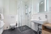 Das stilvoll gestaltete Badezimmer ist ebenfalls hochwertig ausgestattet. Neben der ebenerdigen Dusche mit Regenduschkopf erwarten Sie ein Waschtisch mit Föhn und Kosmetikspiegel, ein WC, ein Handtuchheizkörper und – wie in der gesamten Wohnung – eine angenehme Fußbodenheizung.