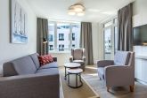 Zur Ausstattung der Ferienanlage gehören außerdem eine Rezeption mit Lobby und Kamin-Lounge, eine Tiefgarage mit inkludiertem Stellplatz (max. Höhe 2 m) sowie gemeinschaftlich nutzbare Waschräume auf jeder Etage. Zwei Aufzüge sorgen für barrierefreien Zugang zu allen Apartments. Fahrräder lassen sich sicher im abschließbaren Kellerraum unterbringen, und vor dem Haus steht eine öffentliche Ladestation für E-Autos zur Verfügung, die gegen Gebühr genutzt werden kann.
