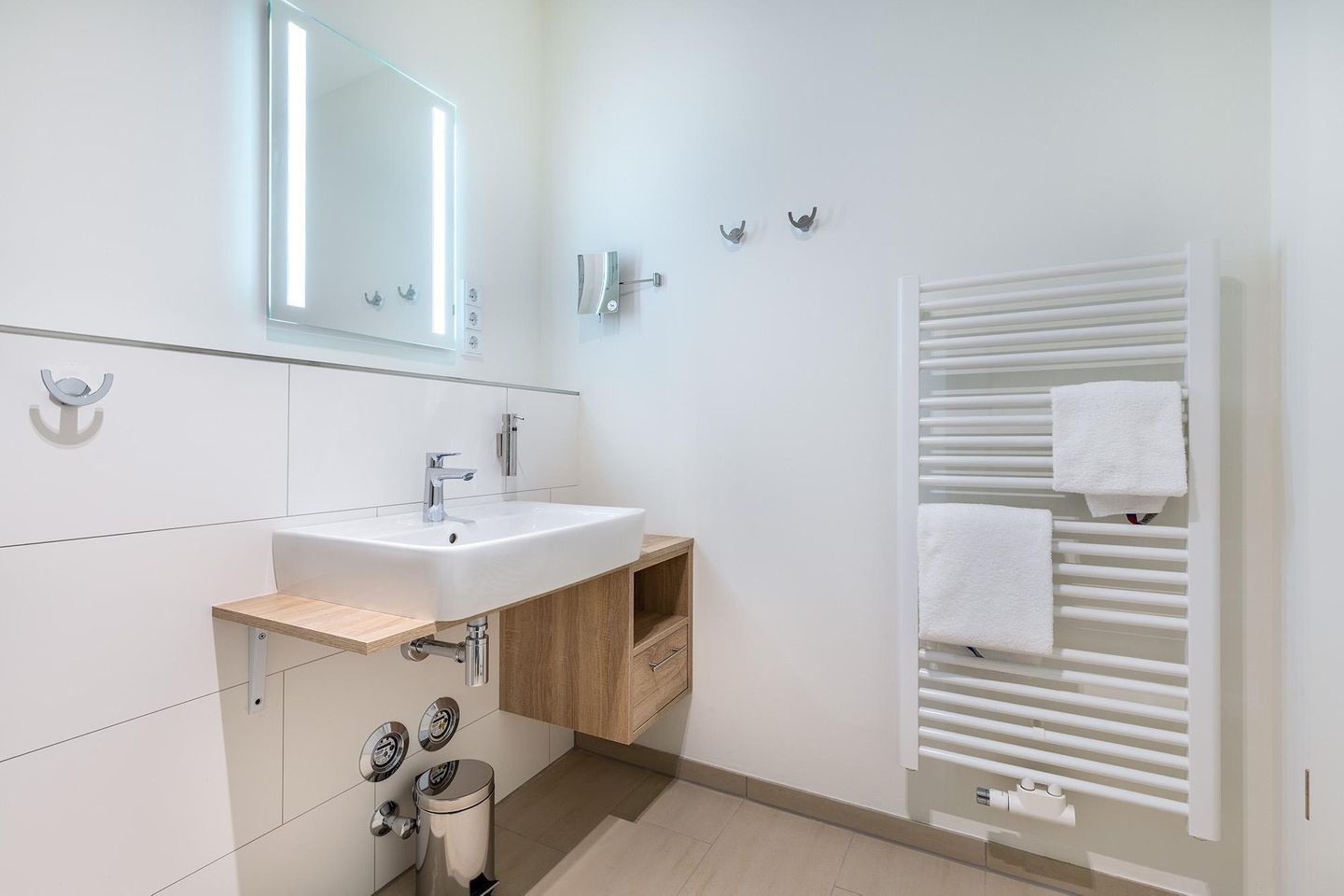 Das moderne Badezimmer ist stilvoll gestaltet und überzeugt mit einer ebenerdigen Regendusche, WC, Waschtisch mit Föhn und Kosmetikspiegel, Handtuchheizkörper sowie ebenfalls mit Fußbodenheizung – hier starten Sie entspannt in den Tag oder lassen ihn ganz in Ruhe ausklingen. Hunde sind ebenfalls willkommen.