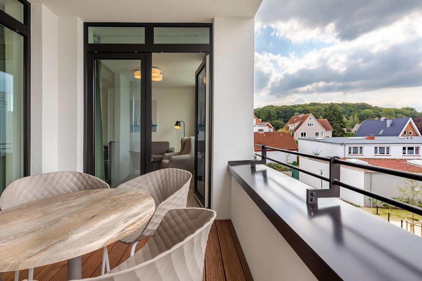 Ein besonderes Highlight ist die überdachte Loggia in sonnenreicher Süd-West-Ausrichtung, die sowohl vom Wohnbereich als auch vom Schlafzimmer aus zugänglich ist. Genießen Sie hier das milde Meeresklima, lassen Sie sich von der Sonne verwöhnen – und das bis in die Abendstunden. Die bequemen Gartenmöbel laden zum Lesen, Essen oder einfach nur zum Durchatmen ein.