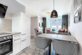 Die hochwertige offene Küche verfügt über moderne Geräte. Der angrenzende Essbereich bietet einen gemütlichen Platz für gemeinsame Mahlzeiten.