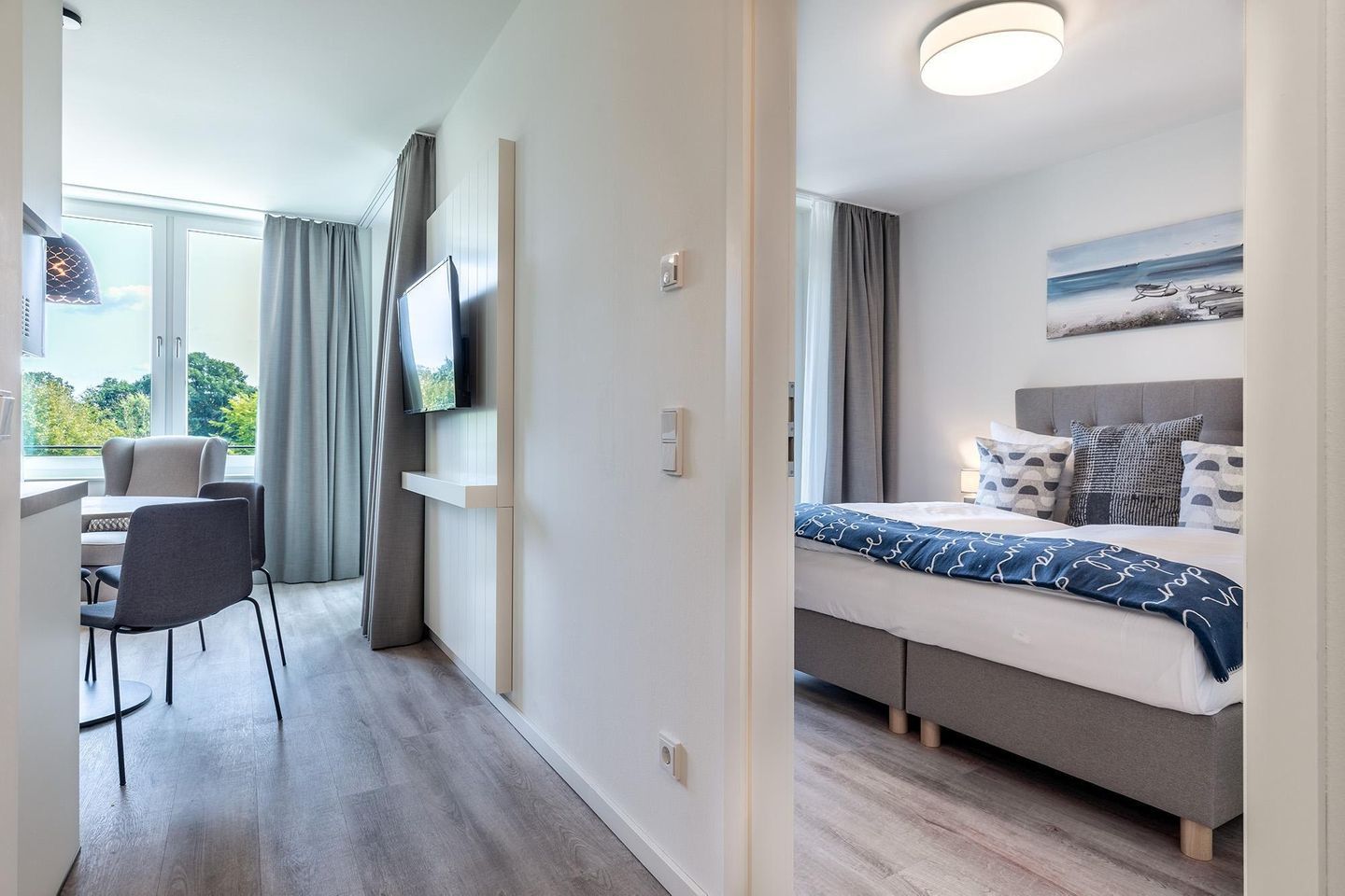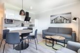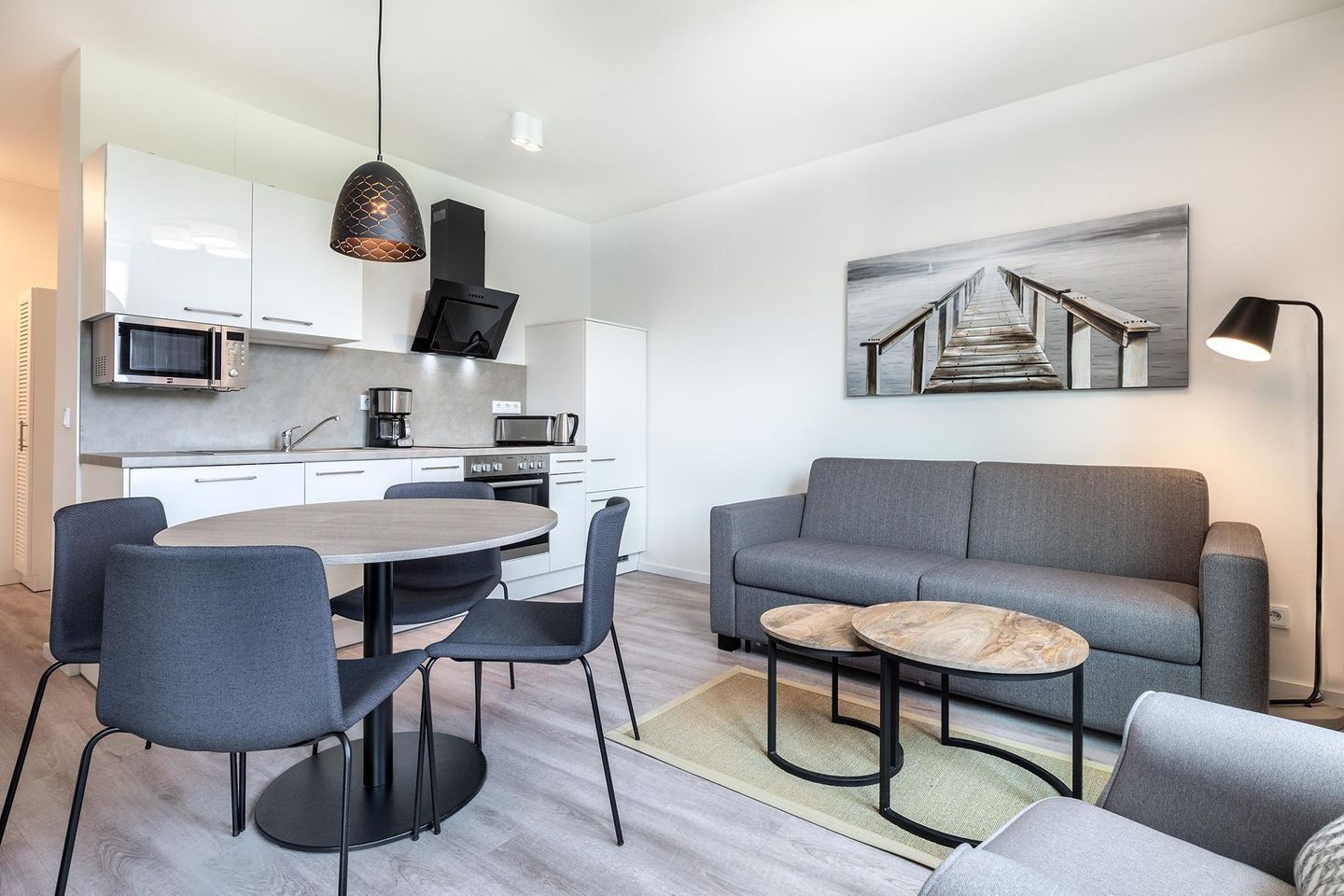 Das Apartment überzeugt durch elegante Gestaltung und hochwertige Materialien. Fußbodenheizung, bodentiefe Fenster mit Sonnenschutzverglasung und kostenfreies WLAN sorgen für hohen Wohnkomfort. Der Wohnbereich mit Doppelschlafcouch (1,40 × 2,00 m) und großem Flatscreen-TV sowie das separate Schlafzimmer mit Boxspringbett (1,80 × 2,00 m) und Flatscreen-TV schaffen ein behagliches Ambiente.