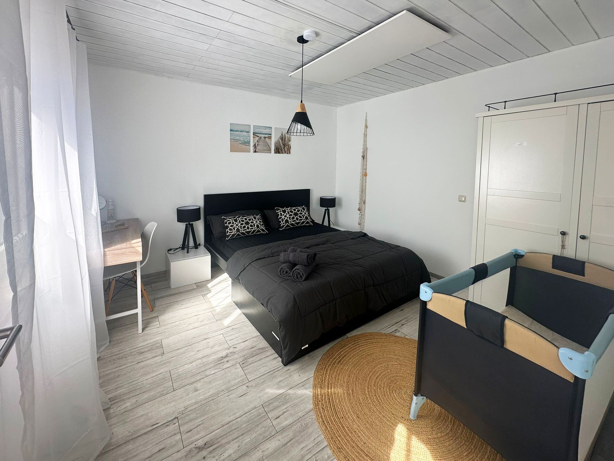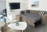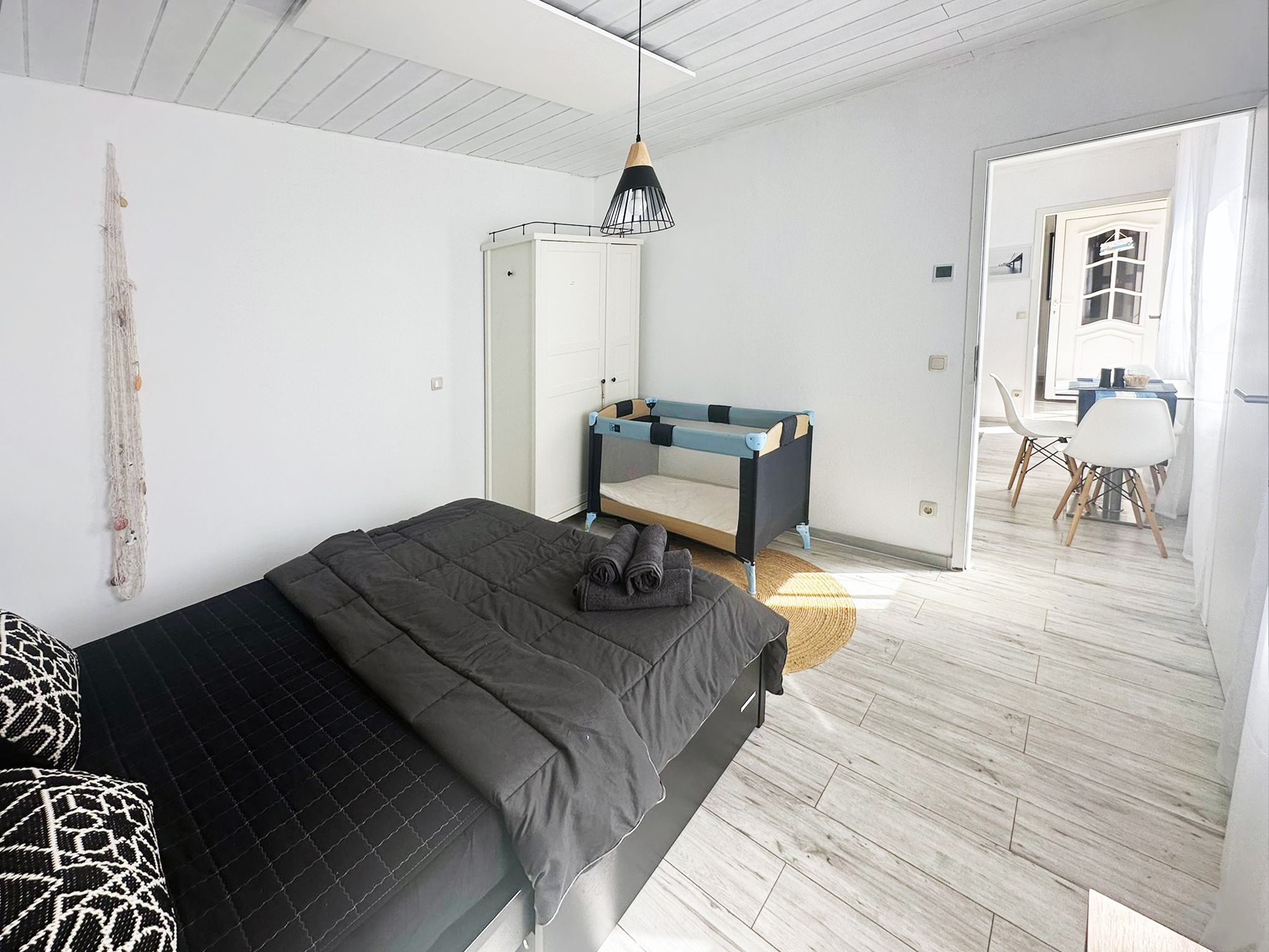 Das Schlafsofa lässt sich zu einem Bett für 2 Personen umwandeln. Im angrenzenden Schlafzimmer steht ein großes Doppelbett zur Verfügung. Hier ist noch ausreichend Platz für ein Kinderreisebett, welches auf Wunsch aufgestellt wird.