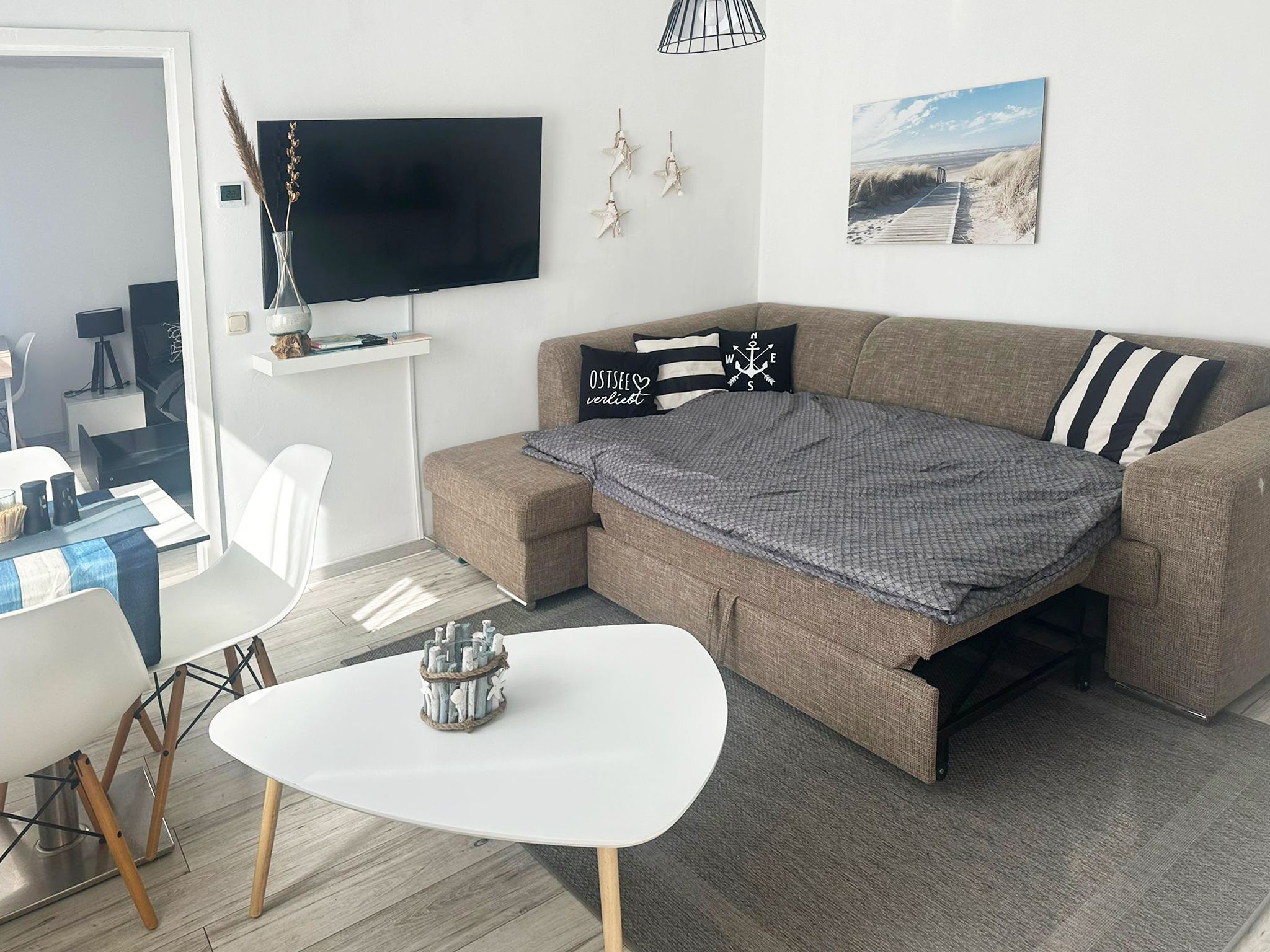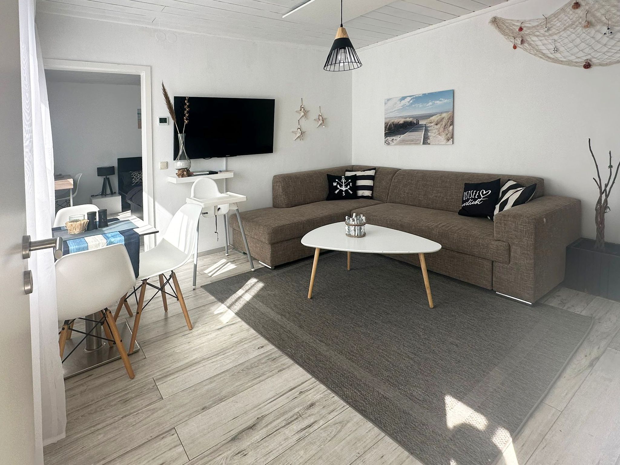 Die moderne, helle 40qm Erdgeschosswohnung hat einen eigenen Eingang. Durch den Flur betritt man die barrierearmen Räume. Linker Hand gelangt man in das kleine Wohn-/Esszimmer mit offener Pantry-Küche. Die Küche ist mit allem ausgestattet, was man für ein paar Tage an der Ostsee benötigt. Auch Geschirrtücher und Reinigungsmittel sind vorhanden.