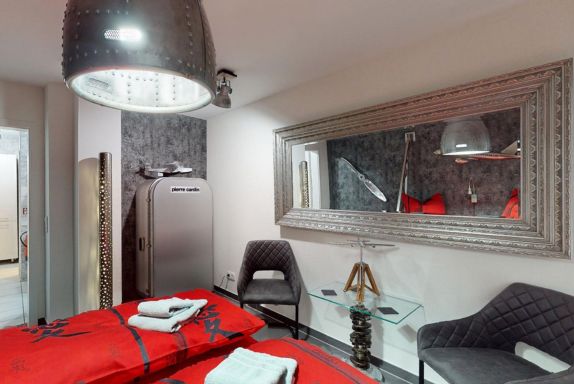 - handgefertigtes Edelstahlbett mit einem Kleiderschrank, der einem historischen Flugkoffer nachempfunden wurde