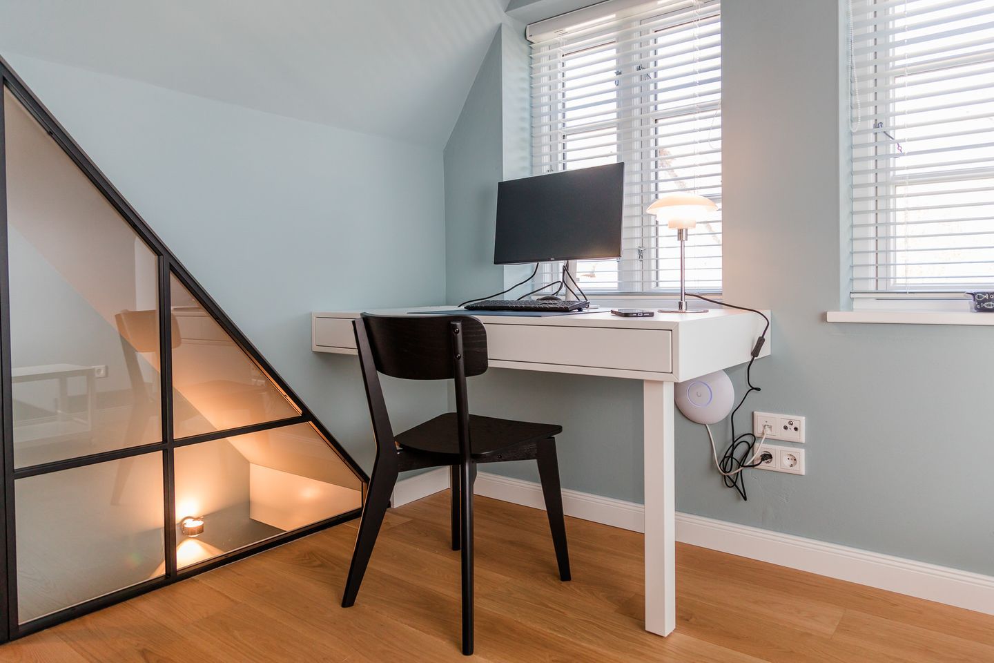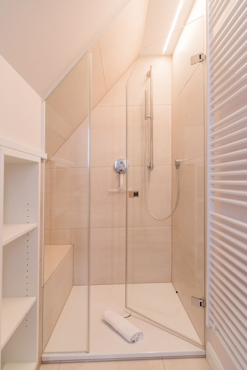Im Erdgeschoss befinden sich der großzügige Wohn- und Essbereich mit offener Küche, eines der drei Schlafzimmer und ein Duschbad. Über den Essbereich gelangen Sie direkt auf die eigene Terrasse und in den Garten. Der Kamin im Wohnbereich sorgt auch an kühleren Tagen für eine angenehme Atmosphäre.
