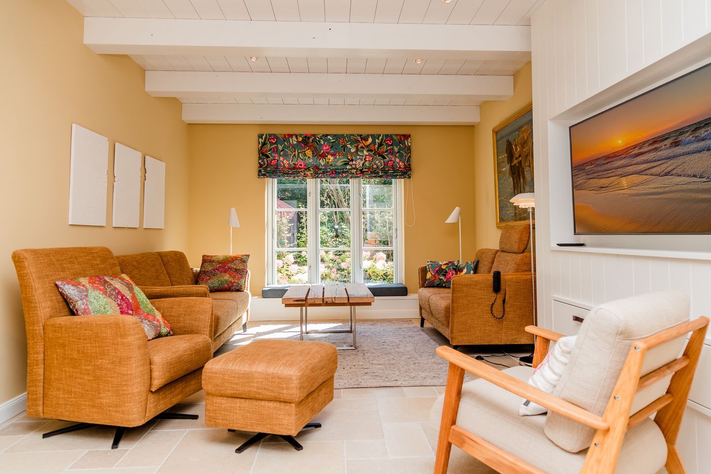 Zu den Highlights der Ferienunterkunft zählen wir u. a. die hauseigene Sauna und den Kamin, sowie die eigene Terrasse im Garten.