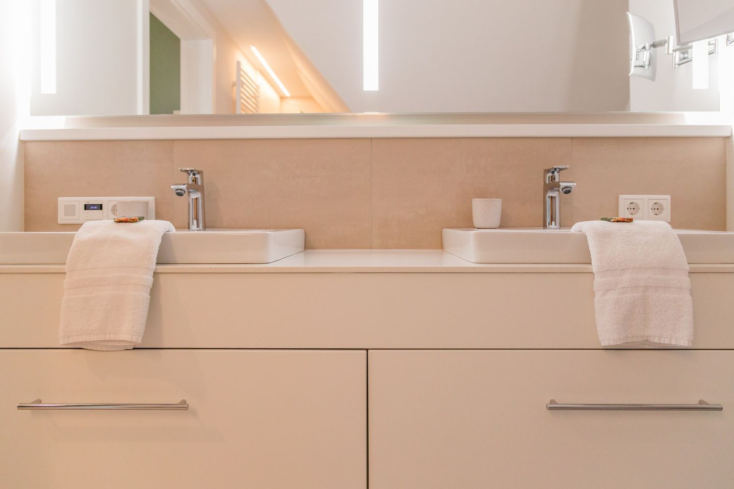 Beide Hausteile sind barrierefrei und damit im Zugang - keine Stufe an den Haustüren - und im Erdgeschoss mit Küche, Bad und Schlafzimmer so ausgelegt, dass sie für die Nutzung mit Rollator oder Rollstuhl gut geeignet sind. Da die Waschbecken im Erdgeschoss jedoch nicht unterfahrbar sind, ist das Haus nicht behindertengerecht.