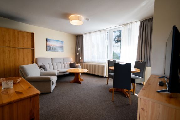 Im Wohnbereich können Sie auf der Couch entspannen. Die Einrichtung ist zweckmäßig und es gibt eine Sitzecke für bis zu 3 Personen.