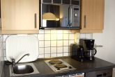 Die kleine, feine Pantryküche ist ausgestattet mit einem 2-Platten-Herd, einer Mikrowelle mit Grillfunktion, einer Spülmaschine und einem Kühlschrank mit Gefrierfach.