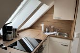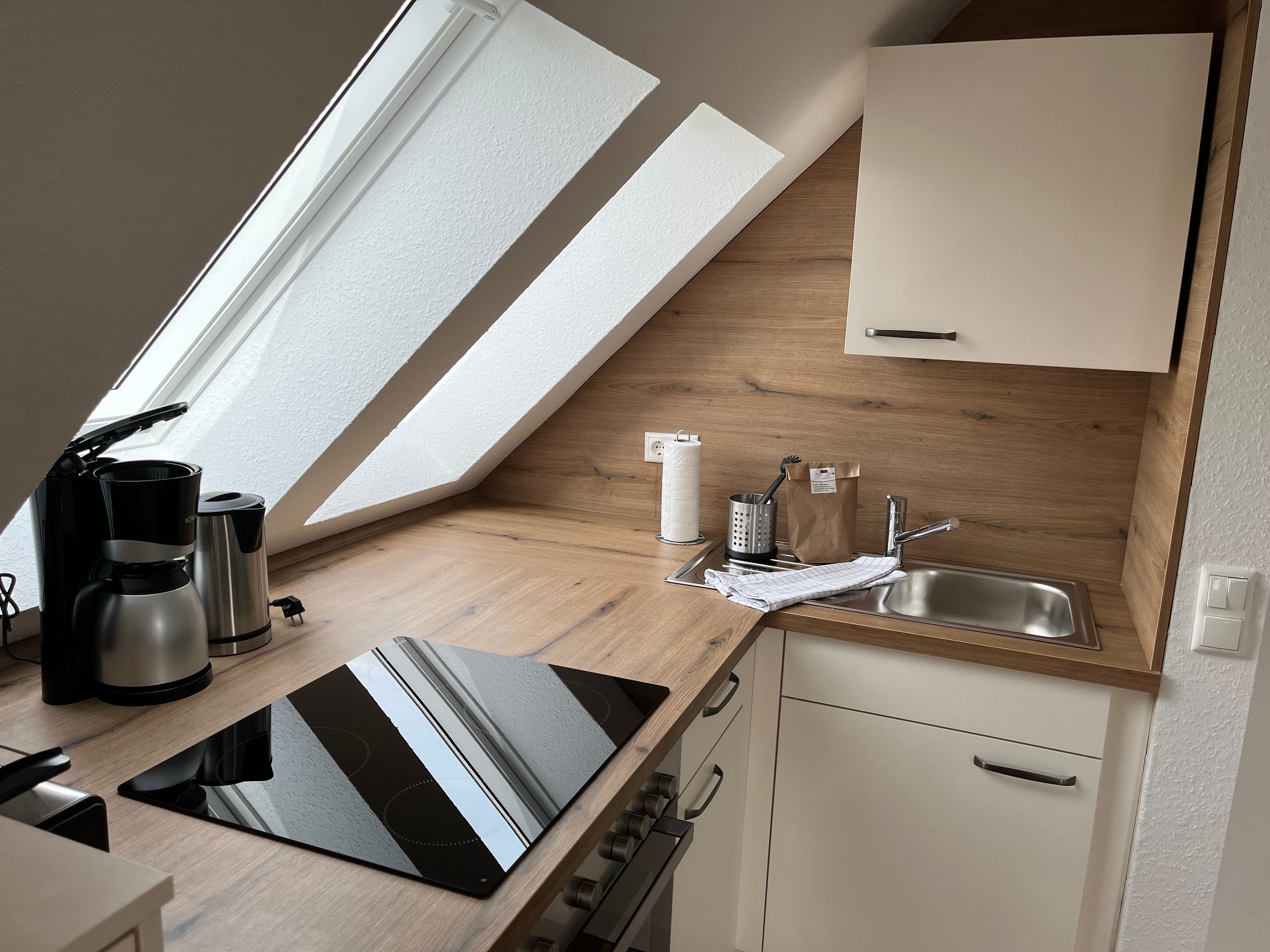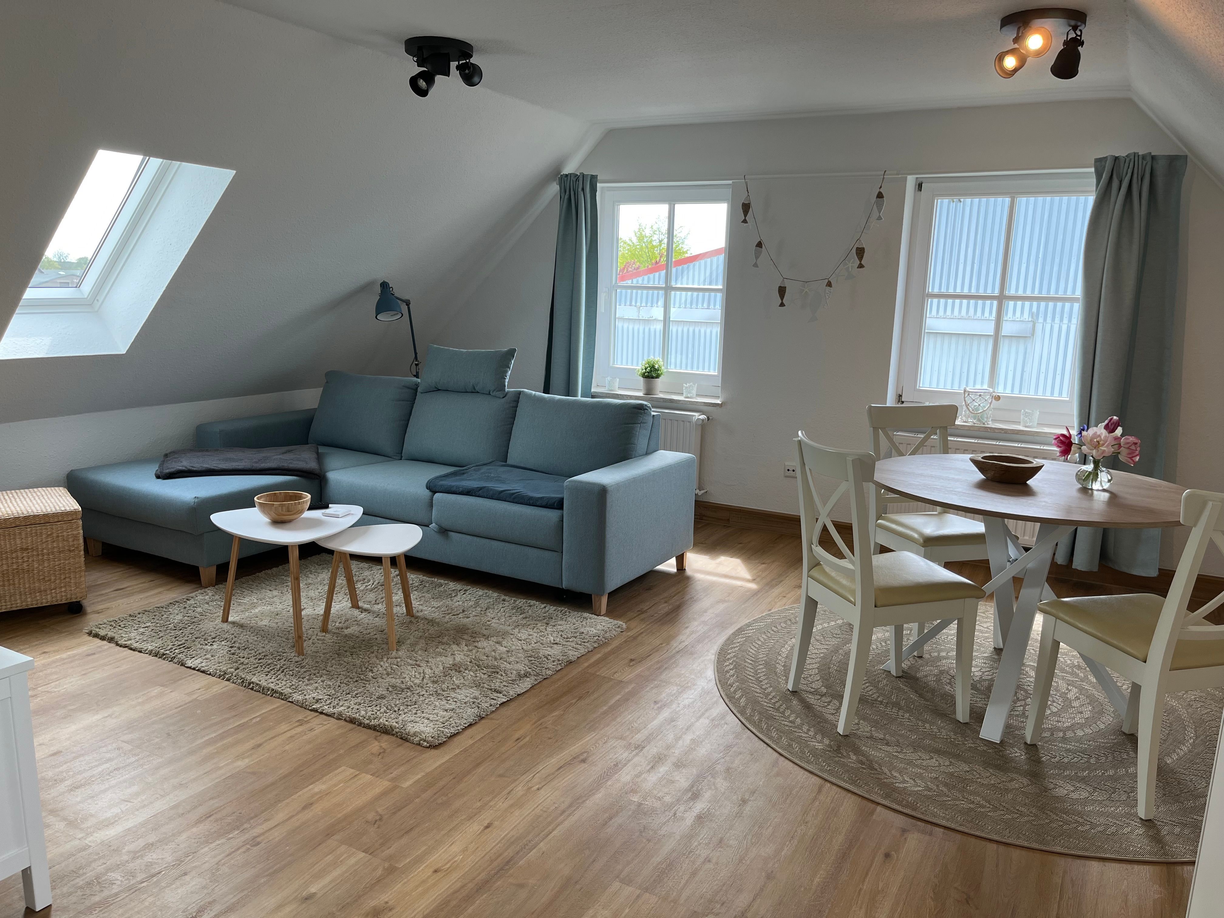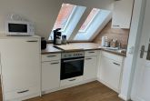 Wohnbereich mit gemütliche Sitzecke und Eßbereich. Küche mit Backofen, Ceranfeld, Mikrowelle, Kühlschrank mit Gefrierfach, Toaster, Kaffeemaschine, Wasserkocher.