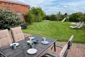 Auf dem Grundstück befindet sich eine Terrasse mit Wiese und für die Kinder Rutsche und Schaukel.