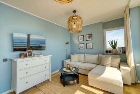 Der Wohnbereich ist mit Möbeln der Marke Riviera Maison ausgestattet bekannt für stilvolles Design und hohe Qualität. Durch den maritimen Einrichtungsstil, moderne Bodenbeläge und ausgewählte Deko entsteht ein harmonisches Wohlfühlambiente.