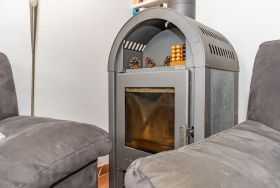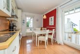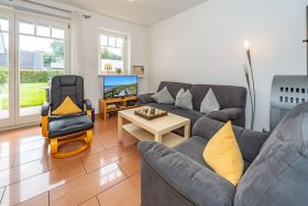 Das helle Wohnzimmer lädt mit seiner gemütlichen Sofaecke, einem Sessel und einem modernen TV zu entspannten Stunden ein. Die offene Küche ist harmonisch in den Wohnbereich integriert und bietet alles, was Sie für die Zubereitung gemeinsamer Mahlzeiten benötigen: Ein Ceranfeld, Backofen mit Elektroanschluss, Mikrowelle, Kühlschrank mit integriertem Gefrierfach, Spülmaschine, Wasserkocher, Kaffeemaschine, Toaster sowie Küchenutensilien, Geschirr und Besteck sind vorhanden. Am Esstisch können Sie in geselliger Runde speisen. Praktische Details wie die Waschmaschine zur Eigennutzung und ein Staubsauger sorgen auch im Alltag für hohen Komfort.