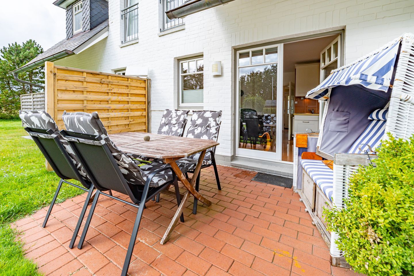 Für naturnahe Erholung steht Ihnen eine private Terrasse mit Blick in den gepflegten Gemeinschaftsgarten zur Verfügung. Hier erwarten Sie bequeme Gartenmöbel und ein exklusiver Strandkorb, der zu entspannten Stunden im Freien einlädt. Der Garten bietet Raum für Kinder und sorgt für ein angenehmes Ambiente. Auch Babys und Kleinkinder sind willkommen –Die Ferienwohnung ist auf Familien bestens vorbereitet.