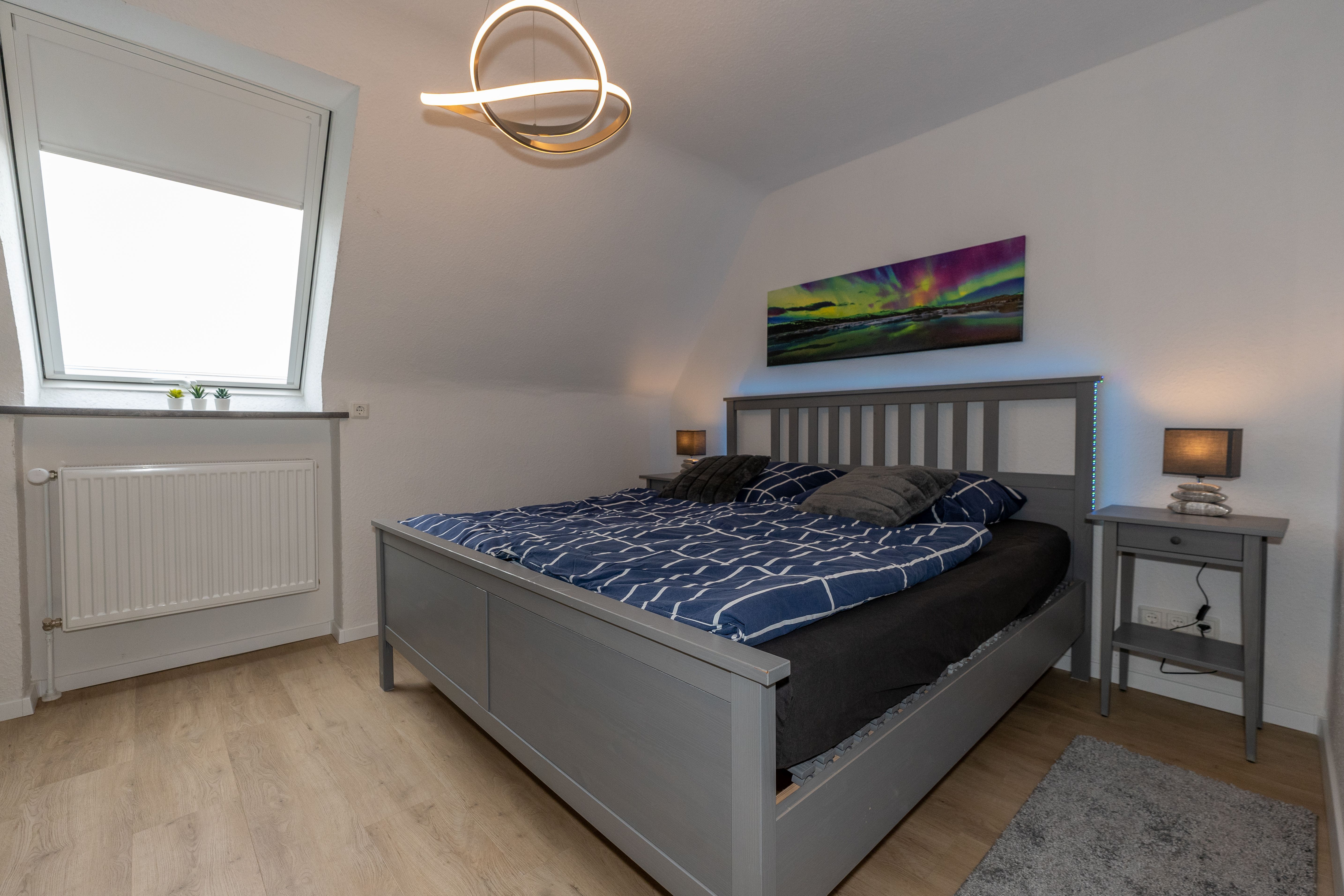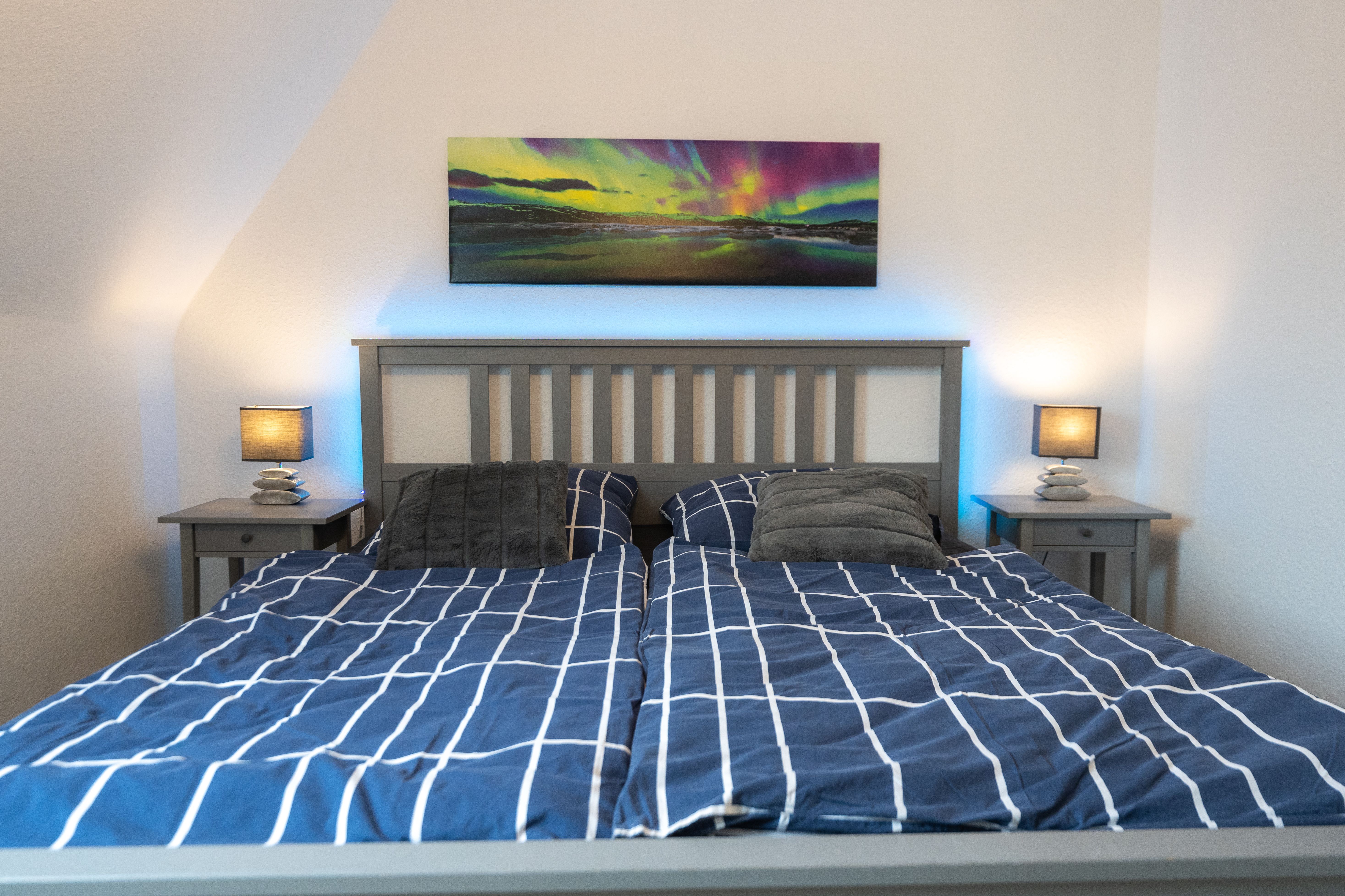 In der Ferienwohnung Nordlicht finden Sie alles, was Sie für einen schönen Aufenthalt benötigen. Zwei Schlafzimmer mit einem 1,80 x 2,0 m großen sowie einem 1,60 x 2,0 m großen Doppelbett, einer gemütlichen Wohnküche mit einer Sofaecke, einem Essplatz für 4 Personen und einer voll ausgestattete Küchezeile mit Ceranfeld, Backofen, Toaster, Mikrowelle, Kaffemaschine und Wasserkocher, Kühlschrank mit Gefrierfach sowie ein Tageslichtbadezimmer mit Dusche bieten Platz für bis zu 4 Personen. Die Wohnküche sowie die Schlafzimmer sind mit Kabel-TV ausgestattet. Alle Zimmer verfügen über Echo-Dots (smarte Lautsprecher). Beide Schlafzimmer sind mit Schränken ausgestattet.