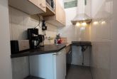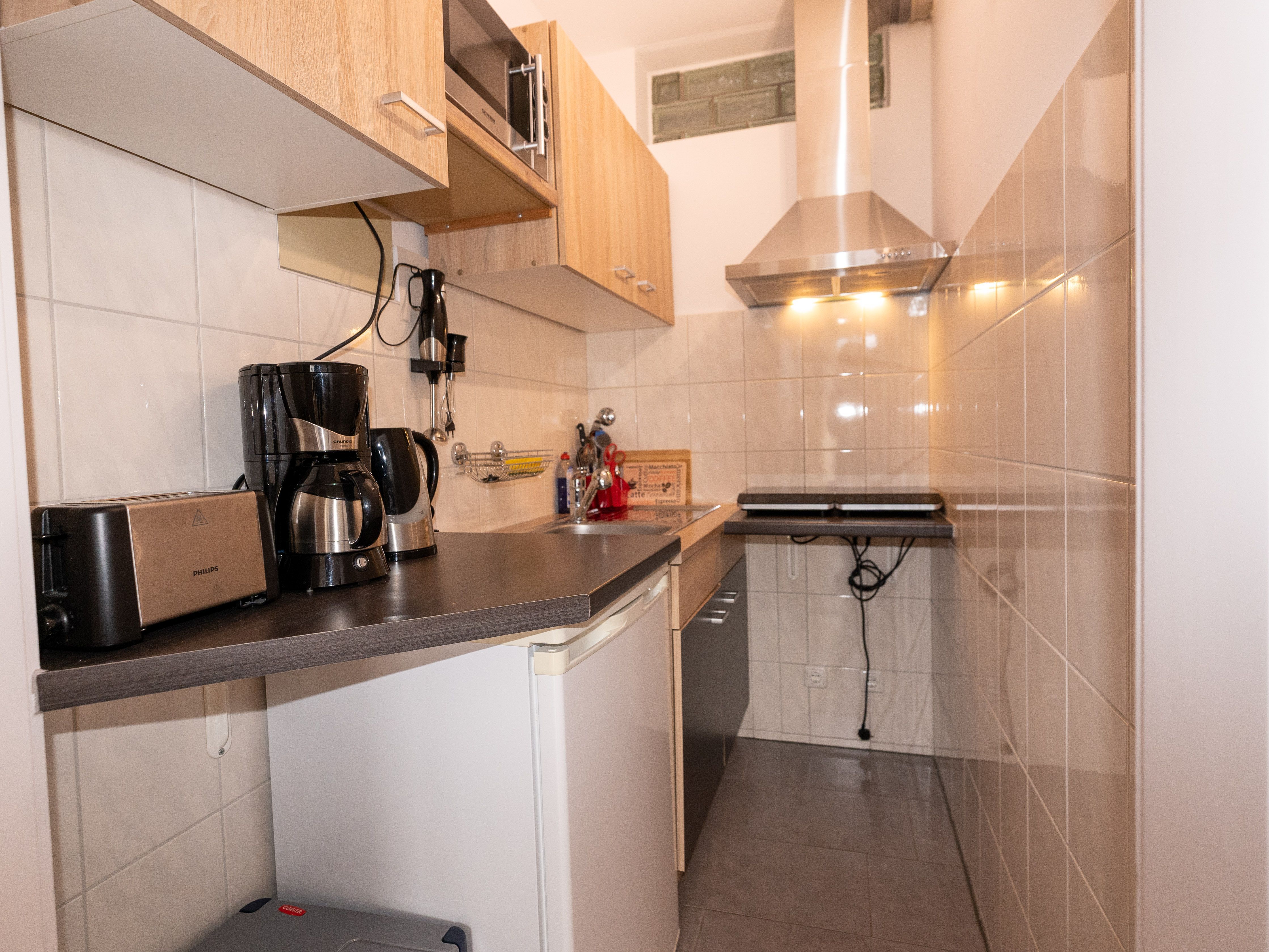 Kühlschrank, 2 x Induktionskochfelder, 1 Kombigerät Backofen (Heißluft, Ober-Unterhitze, Grill, Microwelle), Kaffeemaschine, Wasserkocher, Pürierstab