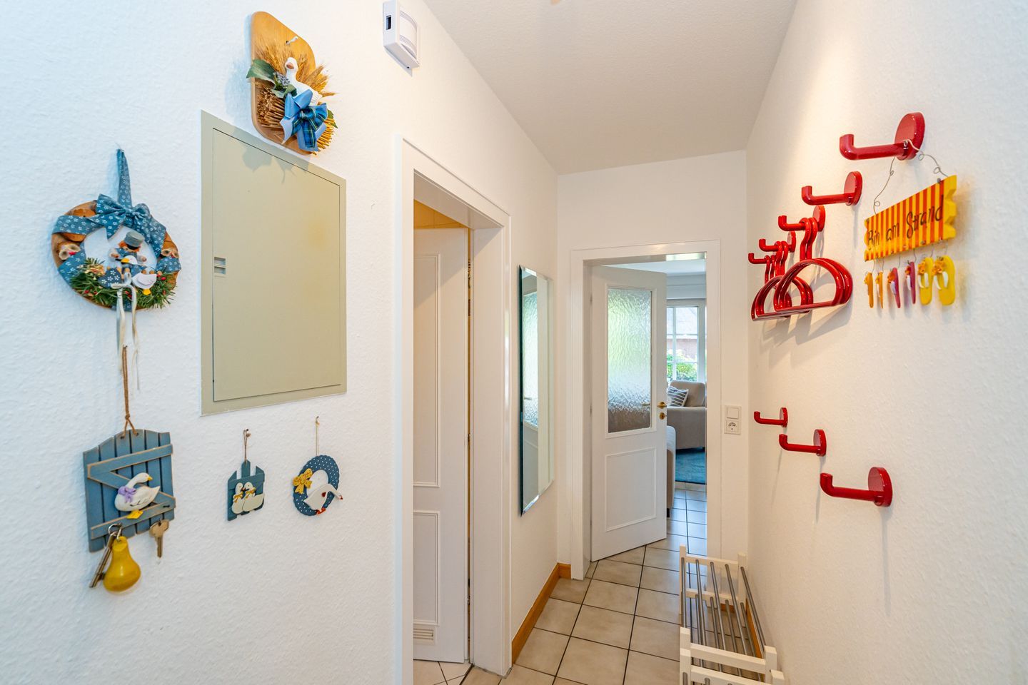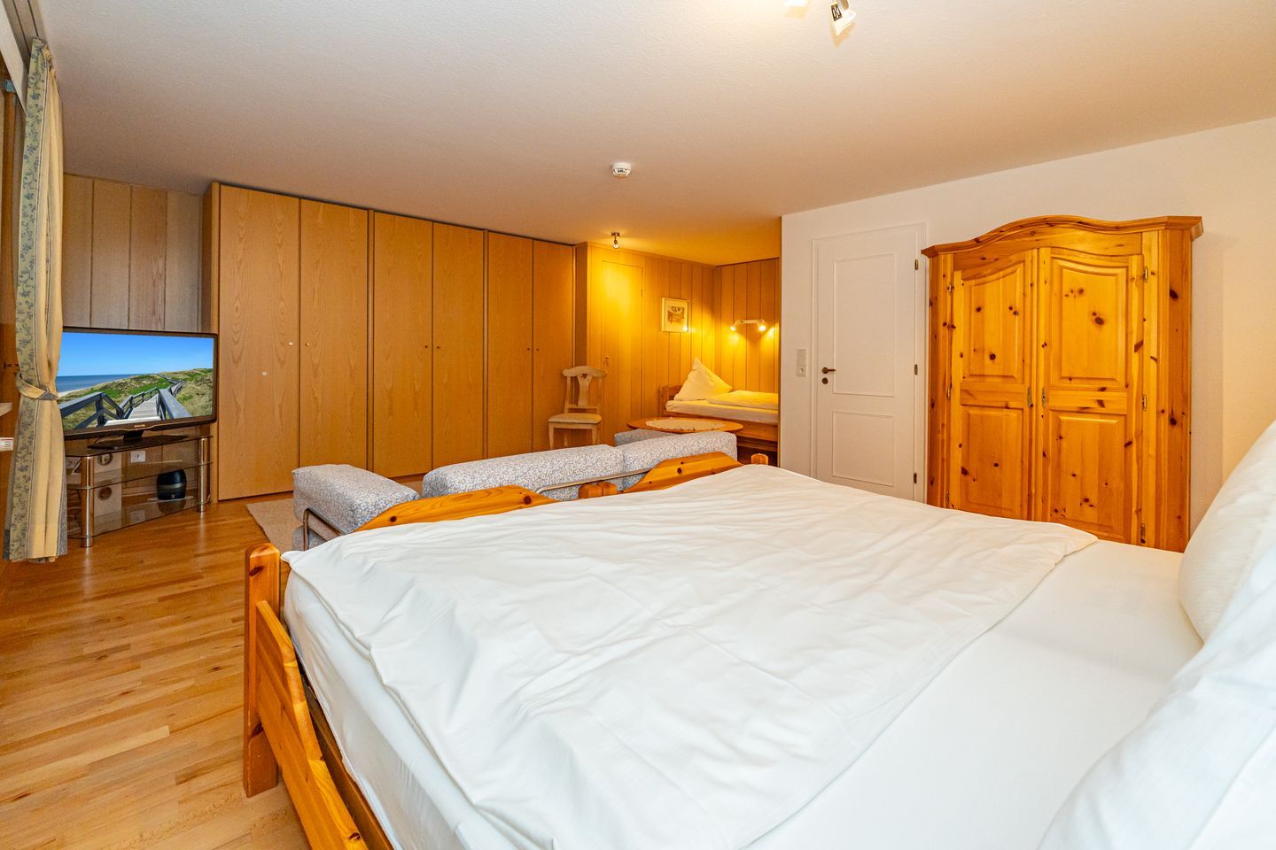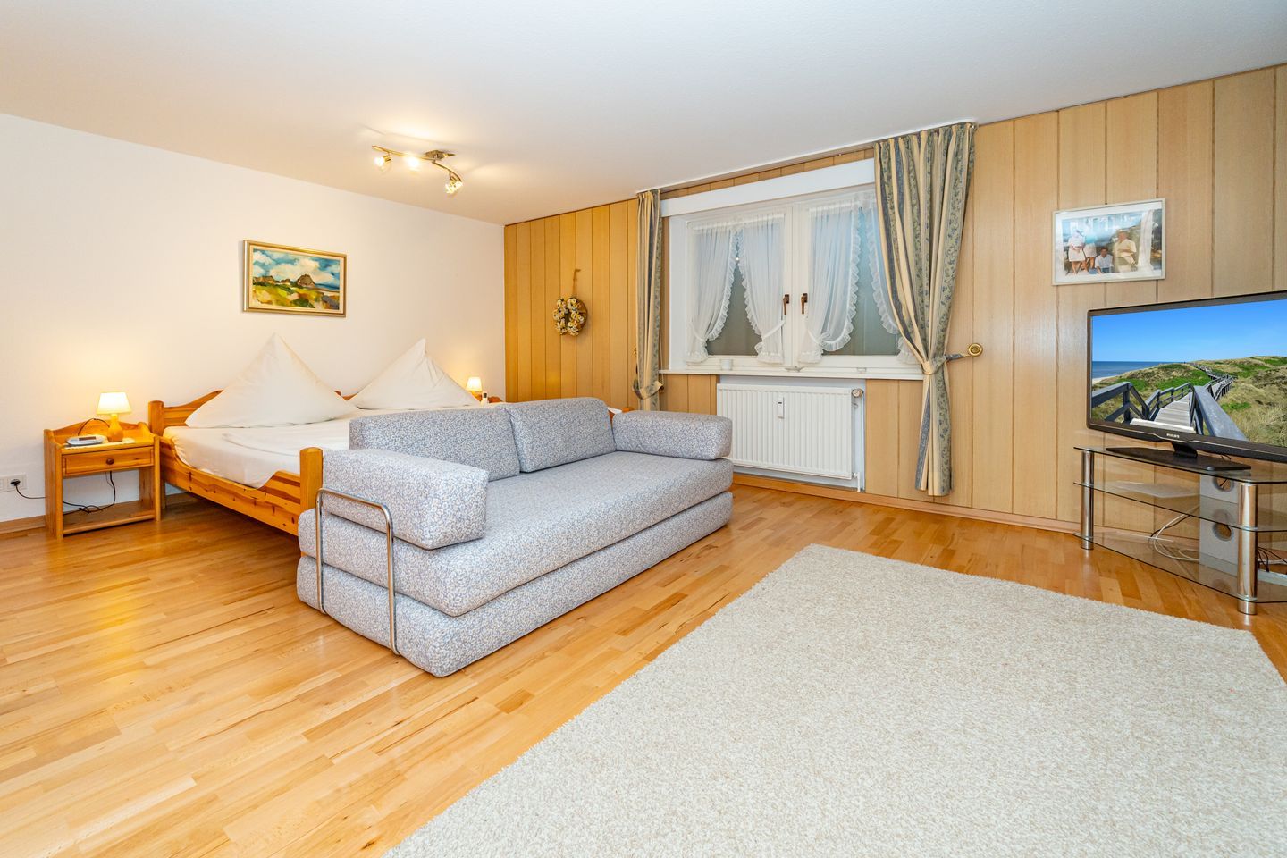 Die Ferienwohnung Rüm hart erstreckt sich über zwei Etagen auf 110qm. Der offene, einladende Wohnbereich ist mit einer Sofaecke, einem Essbereich und einem TV ausgestattet. Von hier aus haben Sie Zutritt zur Terrasse mit Gartenmöbeln (saisonal). Die geschlossene Küche lässt keine Wünsche offen. Sie ist ausgestattet mit einem Ceranherd, Backofen, Kühlschrank mit Gefrierfach, Geschirrspüler, Kaffeefiltermaschine, Wasserkocher, Toaster einen Esstisch. Ebenfalls im Erdgeschoss befindet sich ein Badezimmer mit WC, Waschbecken und Badewanne. Über eine Treppe gelangen Sie ins Souterrain wo sich zwei Schlafzimmer befinden. Das eine Schlafzimmer verfügt über 3 Schlafplätze (1 Doppelbett und 1 Einzelbett), TV und Kleiderschrank und das andere Schlafzimmer verfügt über 2 Schlafplätze (1 Doppelbett) und Kleiderschrank. Auf dieser Ebene befindet sich ein Badezimmer mit WC, Waschbecken und Dusche. Für längere Aufenthalte oder bei Bedarf nutzen Sie die gemeinschaftlich zugängliche Waschmaschine und den Trockner. Zu der Wohnung gehört ein PKW-Stellplatz.
