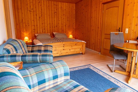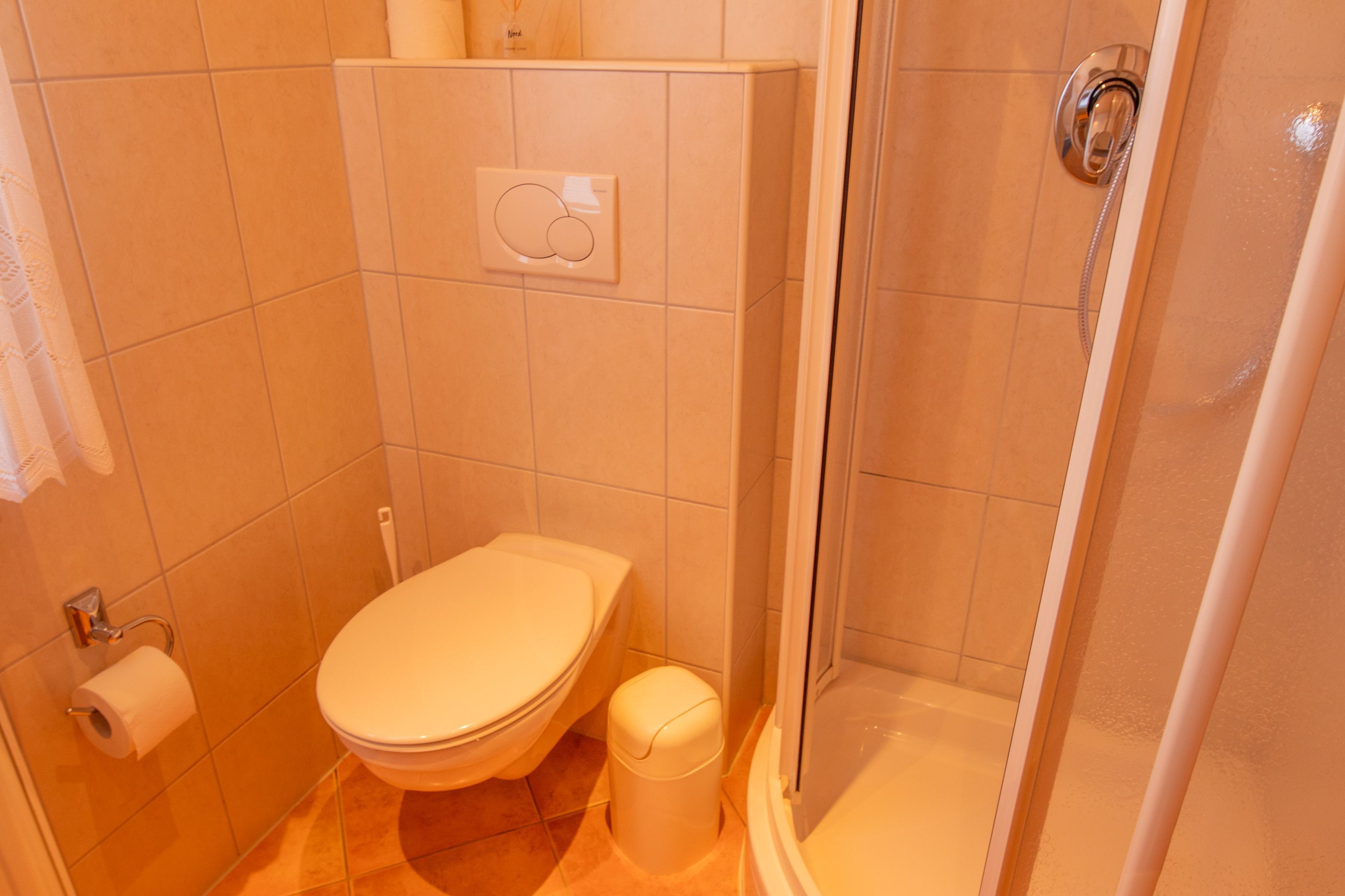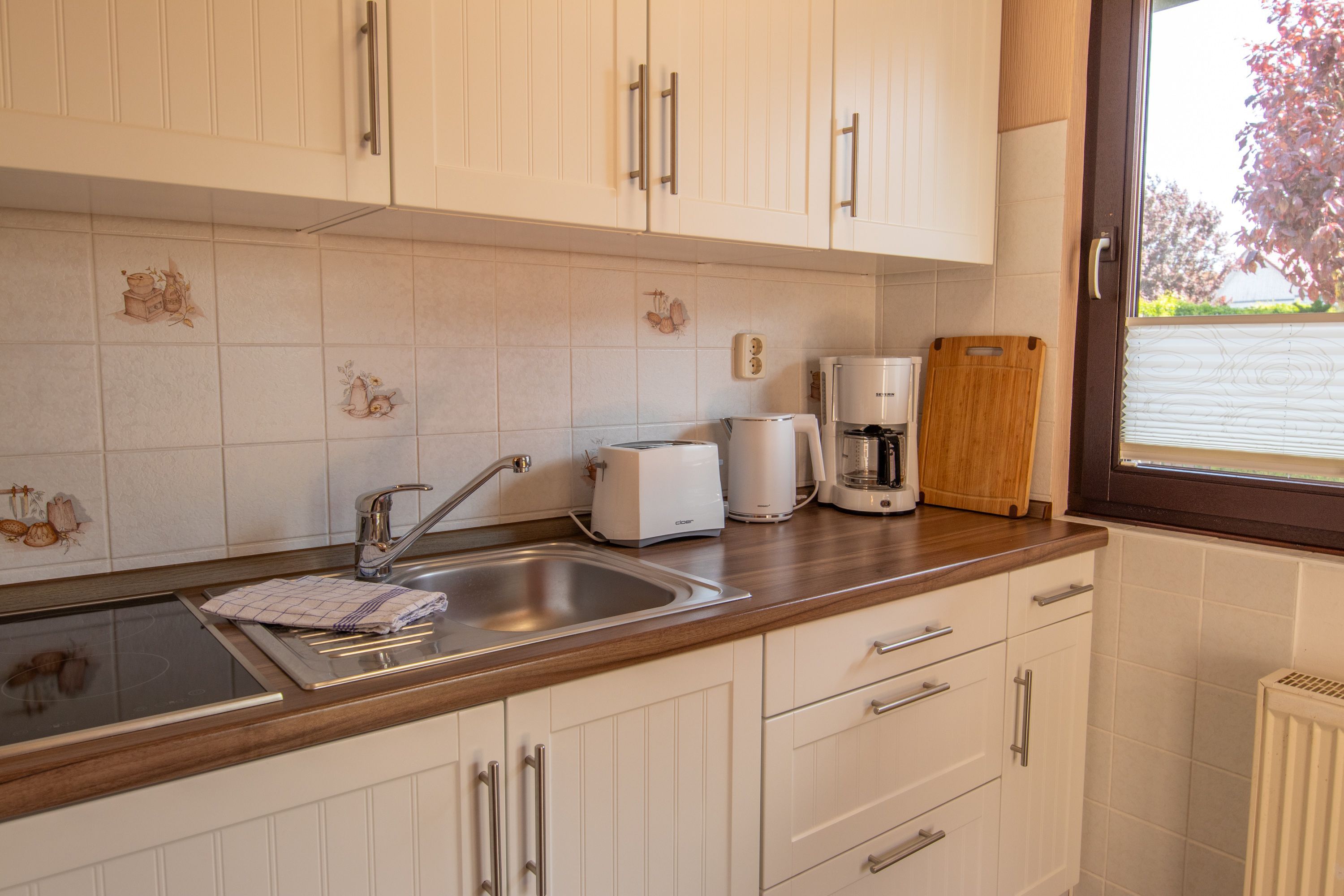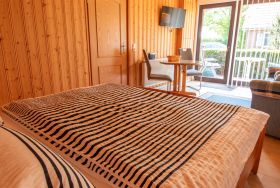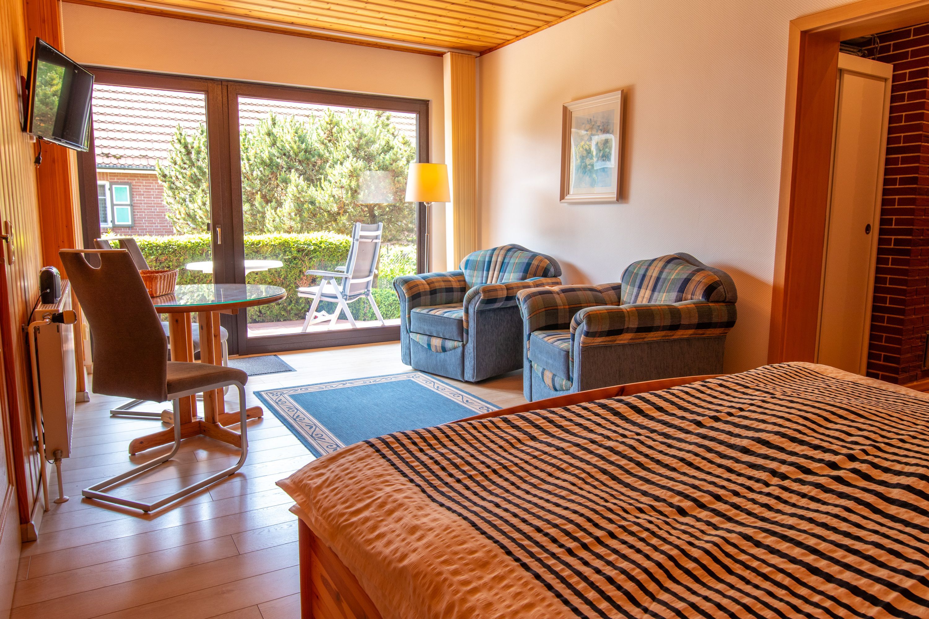 Sie erreichen die Ferienwohnung 1 über einen separaten Eingang am Haus der Vermieter. Im Eingangsbereich erwartet sie eine kleine Küche mit 2-Platten-Kochfeld, Kühlschrank, Kaffeemaschine, Toaster, Wasserkocher und Kochutensilien. Das gemütliche Wohnzimmer verfügt über zwei Sessel, TV, Esstisch und ein Doppelbett (180x200). Von hieraus erreichen sie die Terrasse mit Sitzmöglichkeit und das Bad mit Dusche und WC.