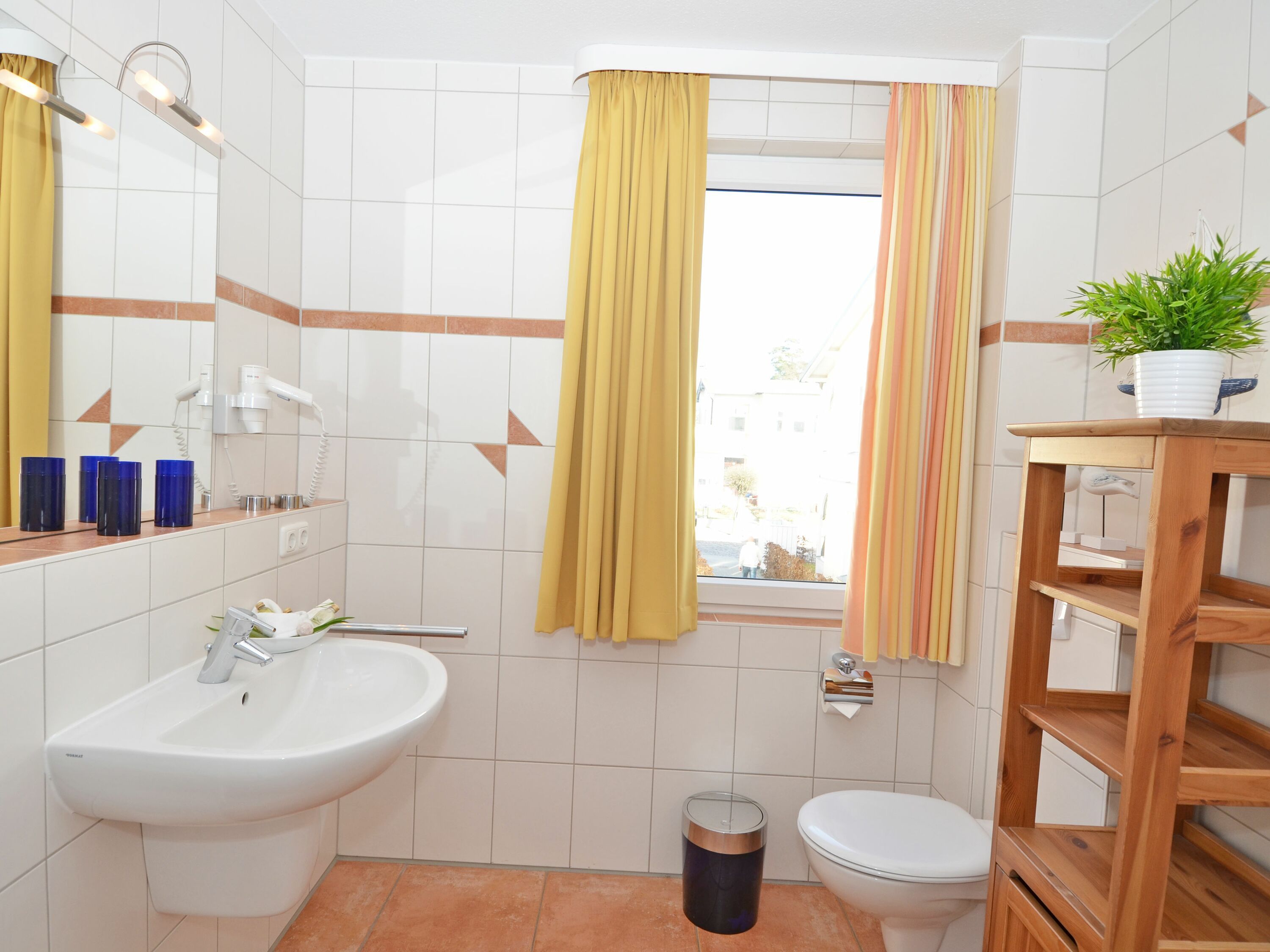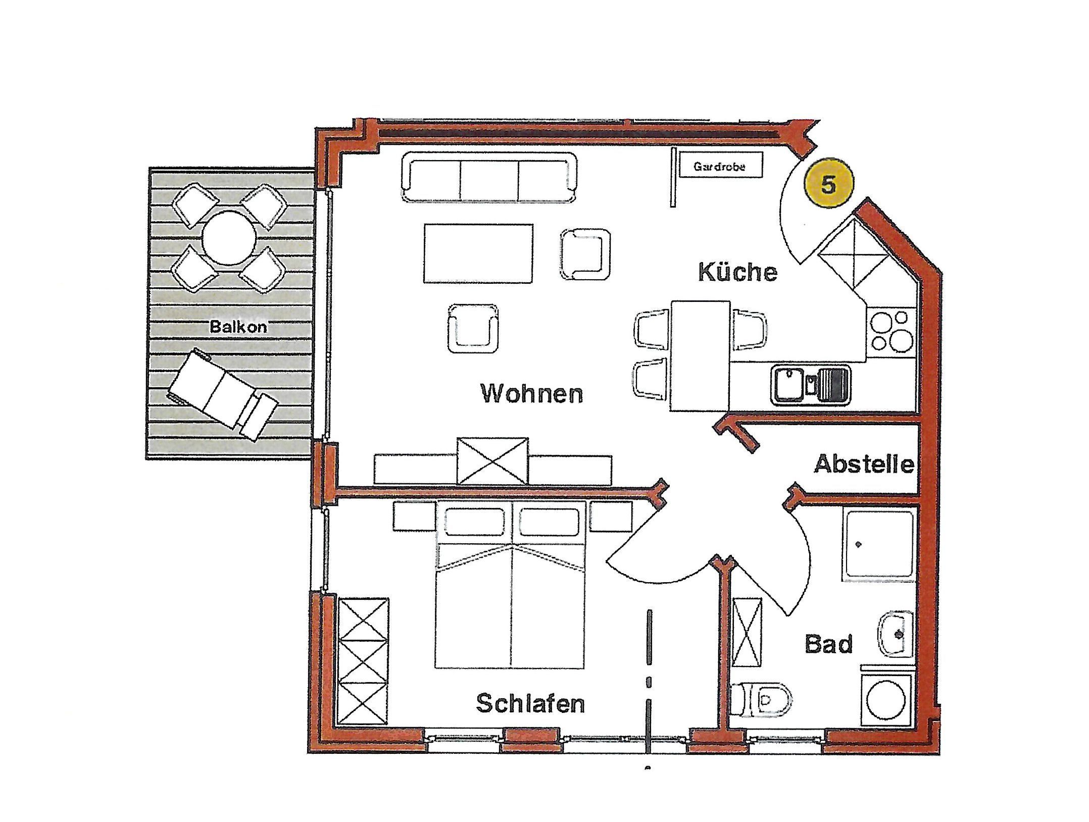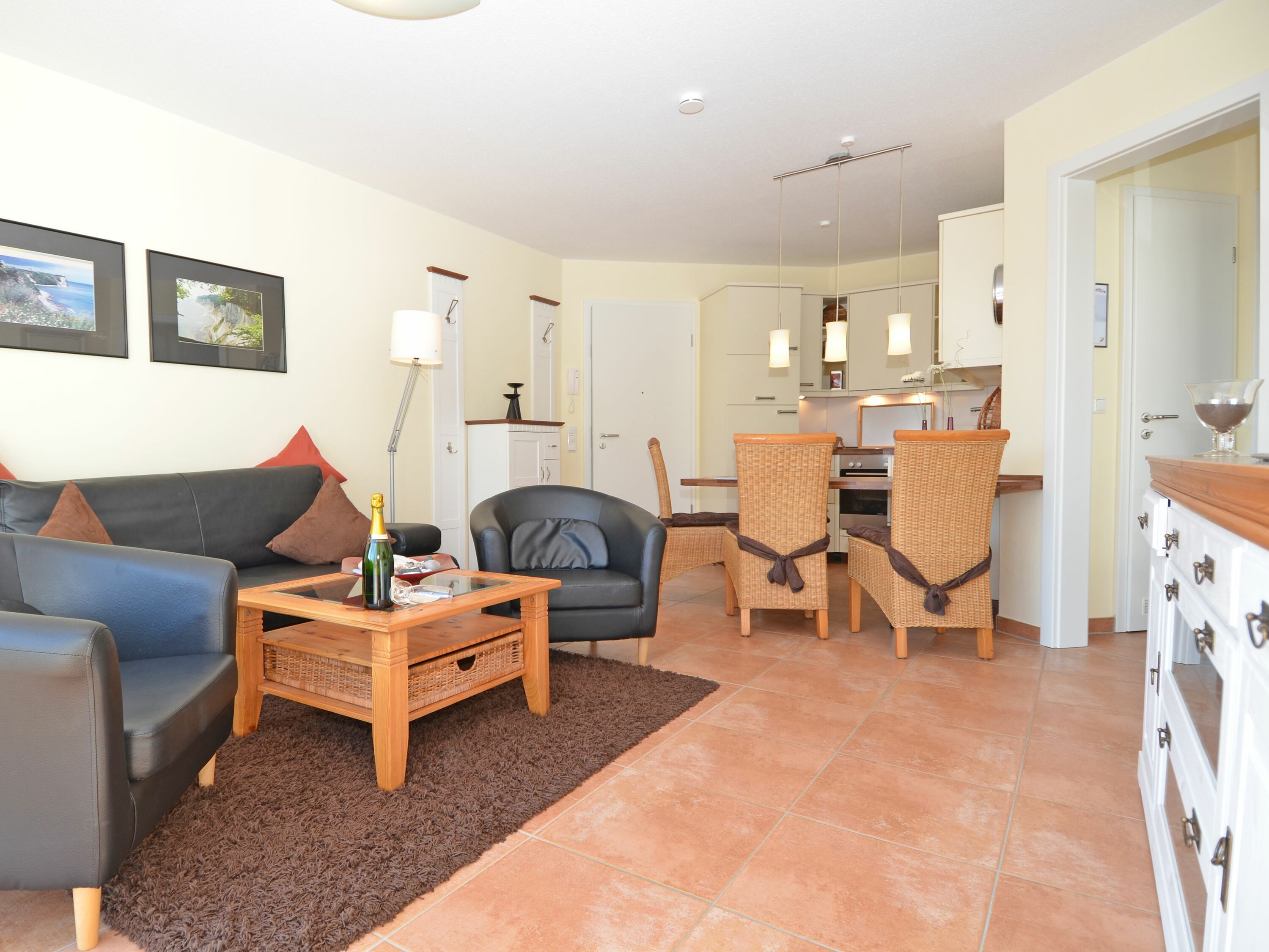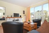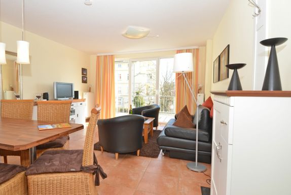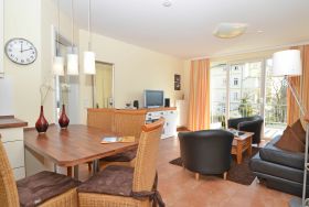 Die schöne 2-Zimmer Ferienwohnung Rügenglück im Haus Möwe verfügt über ca. 50 m² Wohnfläche und befindet sich in der 1. Etage, welche Sie bequem mit dem Fahrstuhl erreichen können. Sie besticht durch eine gut durchdachte Raumaufteilung und bietet Platz für max. 2 bis 3 Personen. Die Nichtraucherwohnung ist mit viel Liebe zum Detail eingerichtet. Sie verfügt über einen geräumigen Wohnraum mit einer bequemen Schlafcouch (Aufbettungsmöglichkeit für 3. Person, 1,60m x 2,00m), zwei Sesseln mit Couchtisch, einer Stehlampe, einem Highboard, einem Sideboard mit Smart-TV, einem DAB-Radio, einer Stereoanlage mit CD-Player, WLANAnschluss und einem DVD-Player. Eine Küchenzeile ist im Wohnbereich harmonisch integriert. Die Küchenzeile ist mit einer Spülmaschine, einer Mikrowelle, einem Kühlschrank, einem Gefrierfach, einem 4 Zonen-Cerankochfeld, einem Backofen, einem Mixer, einem Toaster, einem Wasserkocher, einer Kaffeemaschine und diversem Kleininventar ausgestattet. Ein angrenzender Esstisch komplettiert den Bereich. Auf dem bestuhlten Balkon, welchen Sie vom Wohnbereich erreichen, mit Sonnenschirm und Südost-Ausrichtung können Sie beim gemütlichen Frühstück die Morgensonne und einem kleinen Blick zum Selliner See genießen. Im Schlafzimmer garantiert ein großes Doppelbett in Komforthöhe (1,80 m x 2,00 m), verstellbaren Lattenrosten, Nachttischablagen mit Beleuchtung und einer Kleiderablage für guten Schlaf. In einem großen Kleiderschrank können Sie Ihre Garderobe problemlos verstauen. Koffer u.a. können in einem Abstellraum neben dem geräumigen Duschbad abgestellt werden. Hier finden Sie unteranderem auch ein Bügelbrett, ein Bügeleisen, einen Wäscheständer mit Klammern sowie Reinigungsutensilien. Das Tageslicht-Bad verfügt über eine Fußboden- und Handtuchheizung, einem WC, einem Waschplatz, einer Dusche mit flachem Einstieg, einem Fön sowie einem Kosmetikspiegel. Alle Fenster sind bodentief und mit Isolierverglasung versehen. Mit den Vorhängen können Sie die Räume verdunkeln. Im Gemeinschafskeller können Sie gegen einen Aufpreis die gemeinschaftliche Waschmaschine und den Trockner nutzen. Die Wertmarken können Sie auf Nachfrage während Ihres Urlaubes erwerben. Ein eigener PKW-Stellplatz Nr. 05 und ein Fahrradraum gehören zur Wohnung und befinden sich in der hauseigenen Tiefgarage (Einfahrtshöhe 2,10 m). Ein Haustier ist gegen einen Aufpreis ein gern gesehener Gast. Die Erstausstattung eines Wäschepaketes (komplette Bettwäsche, 1 Duschhandtuch, 1 kleines Handtuch) können Sie bis 14 Tage vor Anreise gegen einen Aufpreis dazu buchen oder durch eigene ergänzen. Ab 2 gebuchten Paketen erhalten Sie einmalig 1 Geschirrhandtuch und 1 Duschvorleger hinzu.