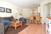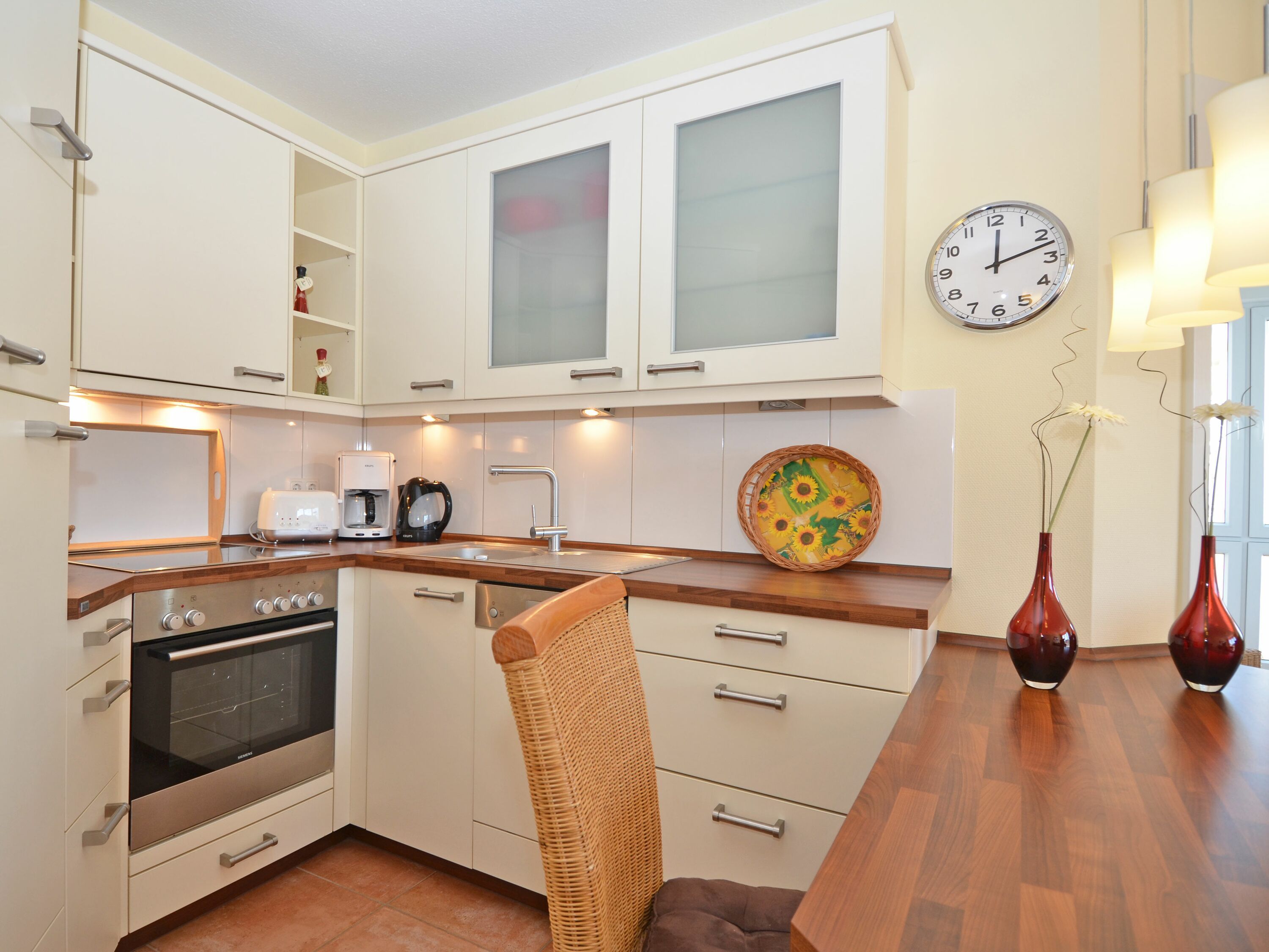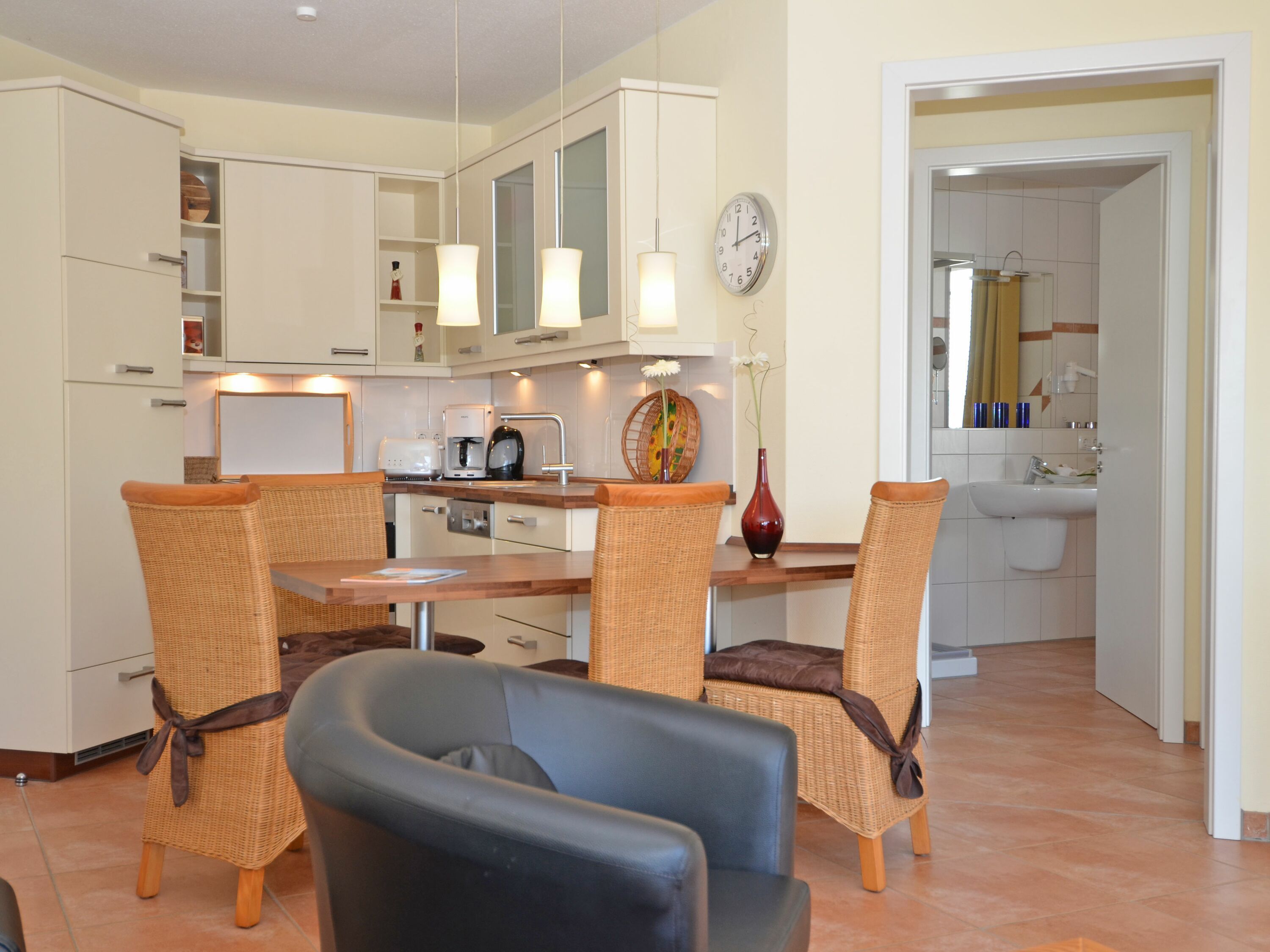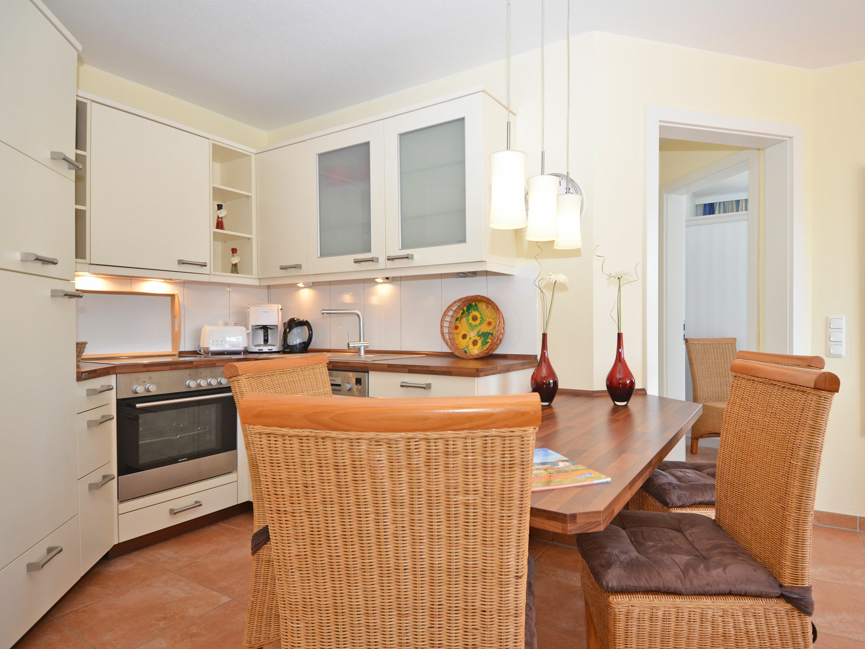 Die schöne 2-Zimmer Ferienwohnung Rügenglück im Haus Möwe verfügt über ca. 50 m² Wohnfläche und befindet sich in der 1. Etage, welche Sie bequem mit dem Fahrstuhl erreichen können. Sie besticht durch eine gut durchdachte Raumaufteilung und bietet Platz für max. 2 bis 3 Personen. Die Nichtraucherwohnung ist mit viel Liebe zum Detail eingerichtet. Sie verfügt über einen geräumigen Wohnraum mit einer bequemen Schlafcouch (Aufbettungsmöglichkeit für 3. Person, 1,60m x 2,00m), zwei Sesseln mit Couchtisch, einer Stehlampe, einem Highboard, einem Sideboard mit Smart-TV, einem DAB-Radio, einer Stereoanlage mit CD-Player, WLANAnschluss und einem DVD-Player. Eine Küchenzeile ist im Wohnbereich harmonisch integriert. Die Küchenzeile ist mit einer Spülmaschine, einer Mikrowelle, einem Kühlschrank, einem Gefrierfach, einem 4 Zonen-Cerankochfeld, einem Backofen, einem Mixer, einem Toaster, einem Wasserkocher, einer Kaffeemaschine und diversem Kleininventar ausgestattet. Ein angrenzender Esstisch komplettiert den Bereich. Auf dem bestuhlten Balkon, welchen Sie vom Wohnbereich erreichen, mit Sonnenschirm und Südost-Ausrichtung können Sie beim gemütlichen Frühstück die Morgensonne und einem kleinen Blick zum Selliner See genießen. Im Schlafzimmer garantiert ein großes Doppelbett in Komforthöhe (1,80 m x 2,00 m), verstellbaren Lattenrosten, Nachttischablagen mit Beleuchtung und einer Kleiderablage für guten Schlaf. In einem großen Kleiderschrank können Sie Ihre Garderobe problemlos verstauen. Koffer u.a. können in einem Abstellraum neben dem geräumigen Duschbad abgestellt werden. Hier finden Sie unteranderem auch ein Bügelbrett, ein Bügeleisen, einen Wäscheständer mit Klammern sowie Reinigungsutensilien. Das Tageslicht-Bad verfügt über eine Fußboden- und Handtuchheizung, einem WC, einem Waschplatz, einer Dusche mit flachem Einstieg, einem Fön sowie einem Kosmetikspiegel. Alle Fenster sind bodentief und mit Isolierverglasung versehen. Mit den Vorhängen können Sie die Räume verdunkeln. Im Gemeinschafskeller können Sie gegen einen Aufpreis die gemeinschaftliche Waschmaschine und den Trockner nutzen. Die Wertmarken können Sie auf Nachfrage während Ihres Urlaubes erwerben. Ein eigener PKW-Stellplatz Nr. 05 und ein Fahrradraum gehören zur Wohnung und befinden sich in der hauseigenen Tiefgarage (Einfahrtshöhe 2,10 m). Ein Haustier ist gegen einen Aufpreis ein gern gesehener Gast. Die Erstausstattung eines Wäschepaketes (komplette Bettwäsche, 1 Duschhandtuch, 1 kleines Handtuch) können Sie bis 14 Tage vor Anreise gegen einen Aufpreis dazu buchen oder durch eigene ergänzen. Ab 2 gebuchten Paketen erhalten Sie einmalig 1 Geschirrhandtuch und 1 Duschvorleger hinzu.