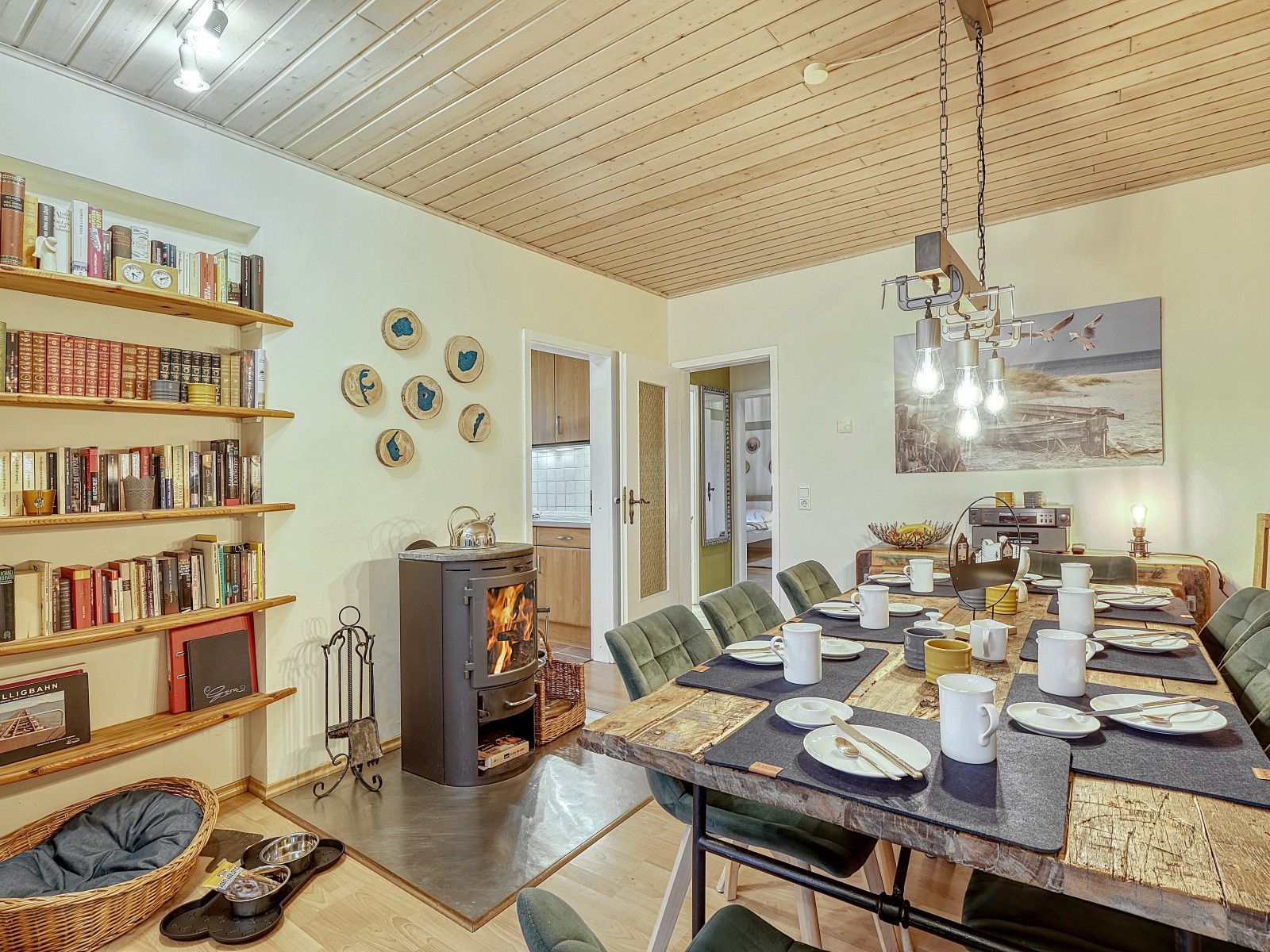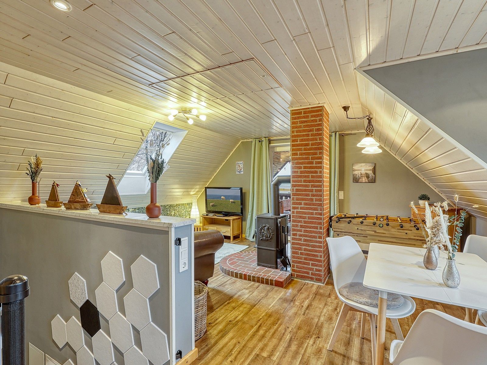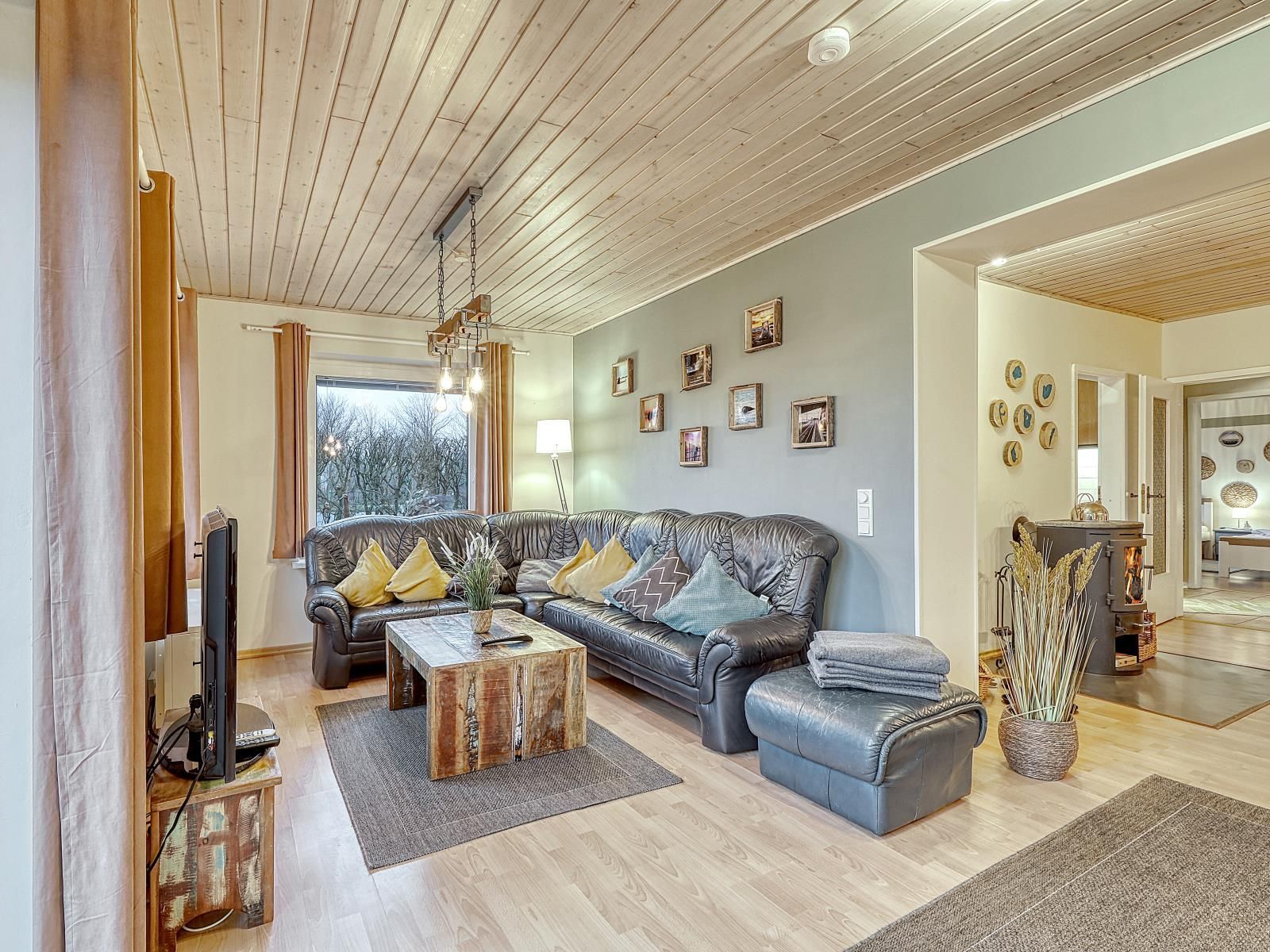 Auf zwei Etagen verteilen sich vier Schlafzimmer, zwei Bäder sowie zwei PKW-Stellplätze, sodass das Haus sowohl für Familien als auch für befreundete Paare bestens geeignet ist. Zwei gemütliche Kaminöfen schaffen in den kühleren Monaten eine behagliche Atmosphäre, ideal nach einem Spaziergang am Meer.
