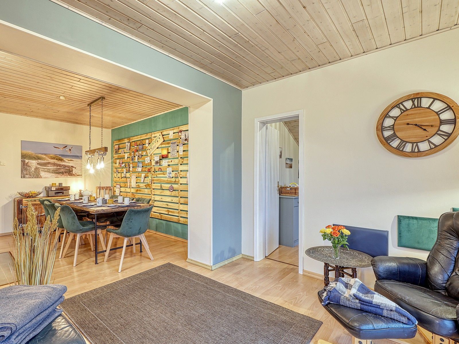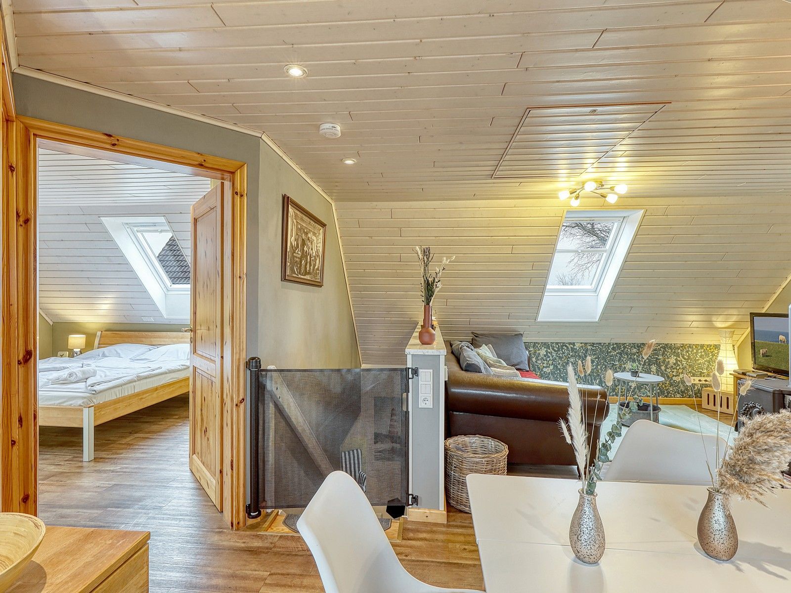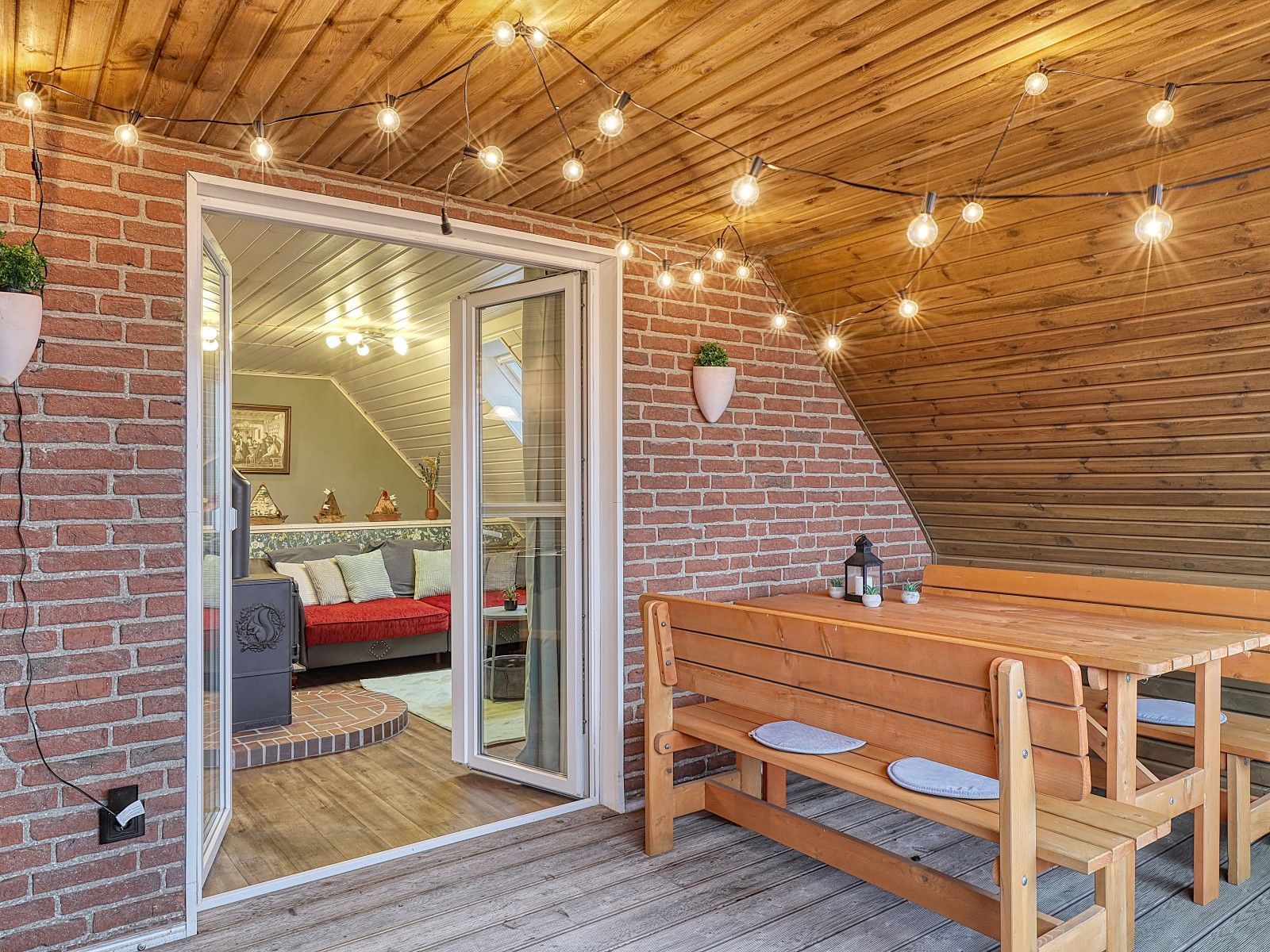 Auf zwei Etagen verteilen sich vier Schlafzimmer, zwei Bäder sowie zwei PKW-Stellplätze, sodass das Haus sowohl für Familien als auch für befreundete Paare bestens geeignet ist. Zwei gemütliche Kaminöfen schaffen in den kühleren Monaten eine behagliche Atmosphäre, ideal nach einem Spaziergang am Meer.