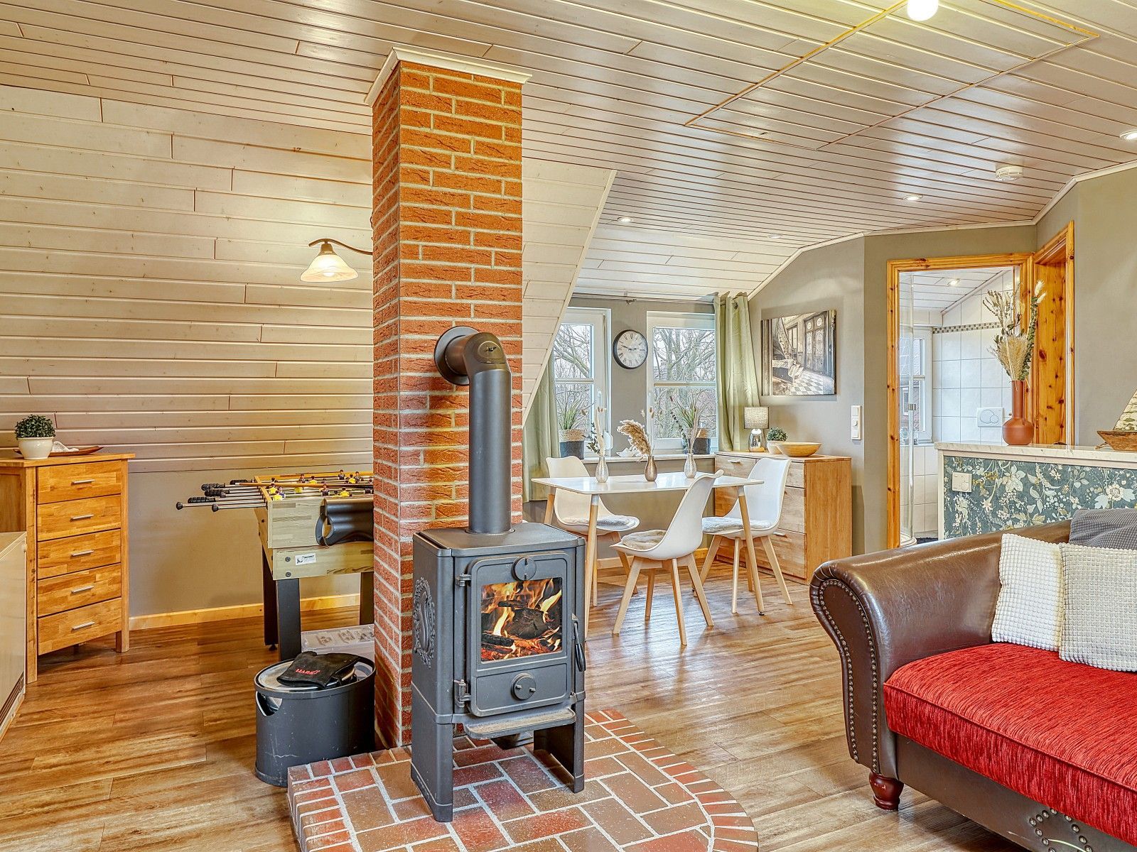 Der weitläufige Garten bietet Platz zum Entspannen, Spielen und Grillen. Für sportliche Abwechslung stehen Badmintonschläger, Nordic-Walking-Stöcke und Tischfußball bereit. Auch für Kinder ist mit Spielzeug und Beschäftigungsmöglichkeiten gesorgt.