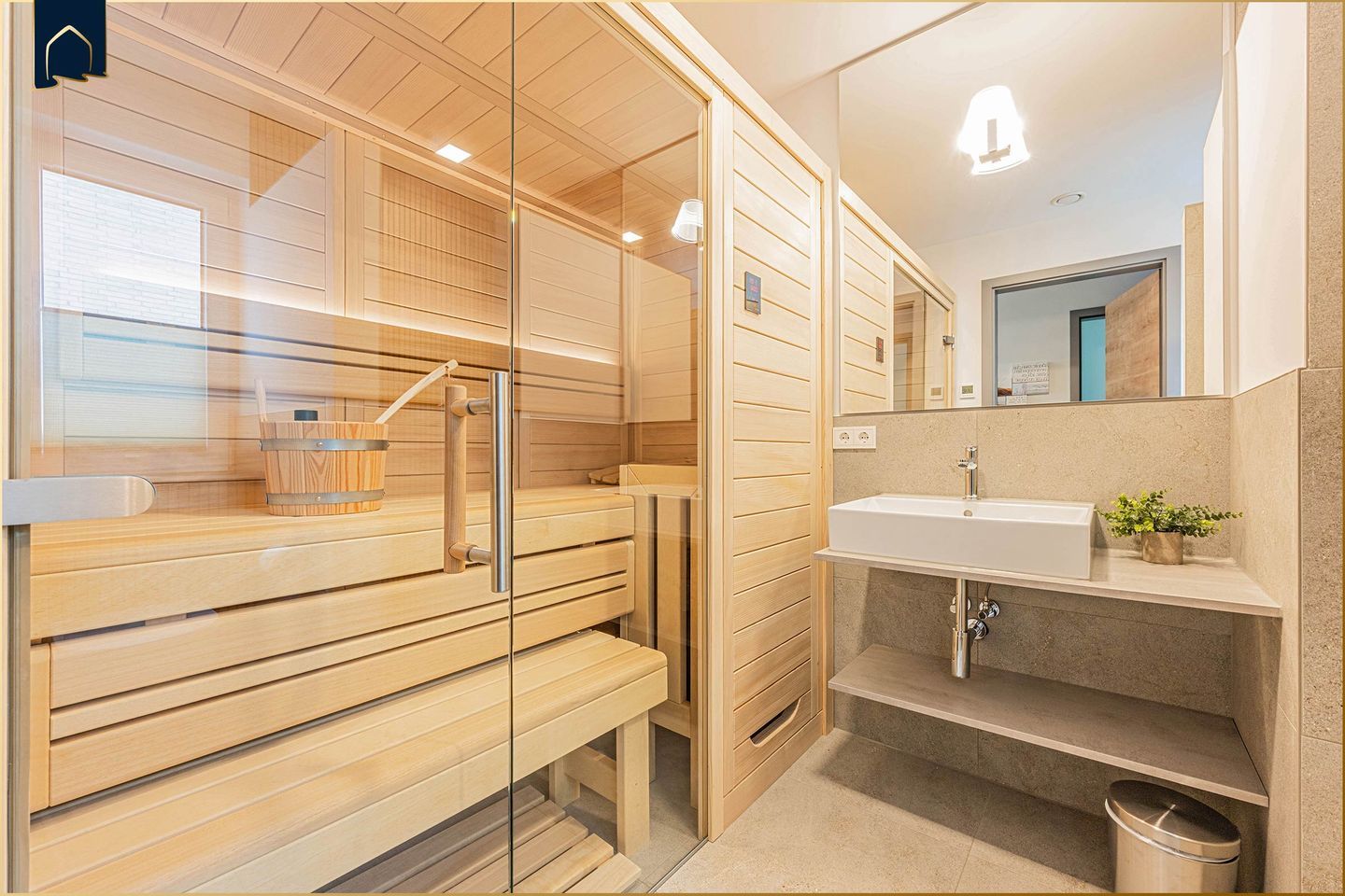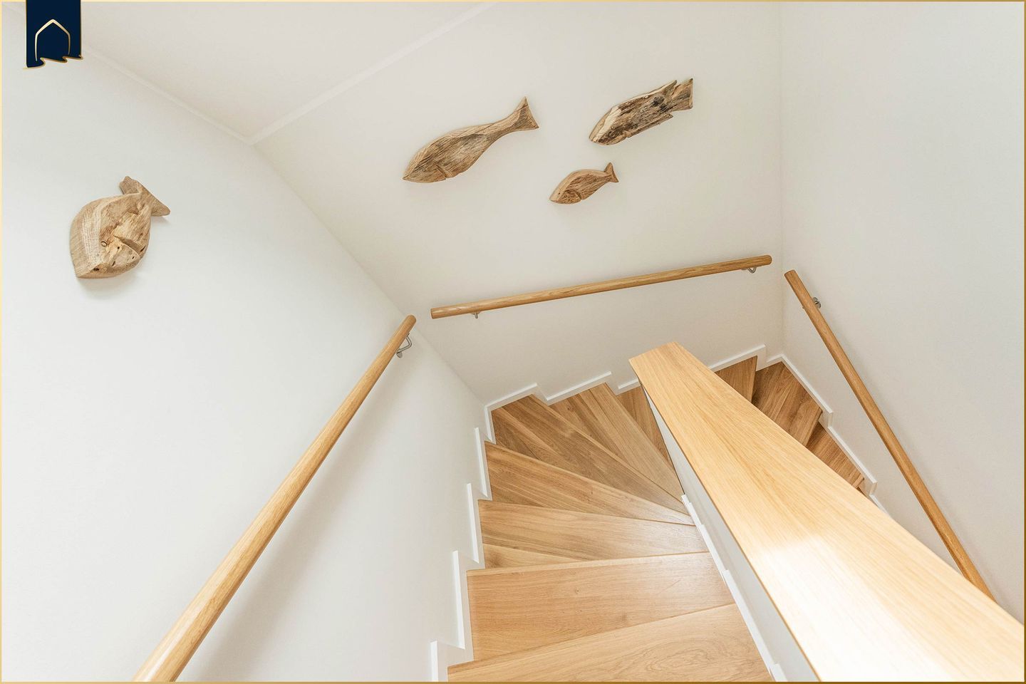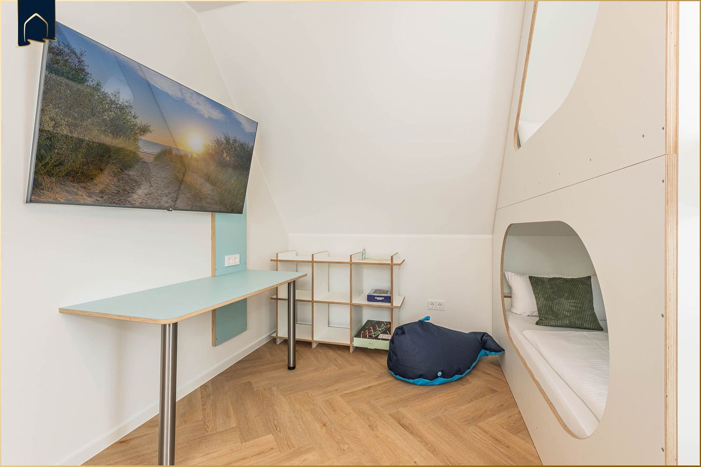 Die offene Wohnküche ist hochwertig ausgestattet mit Backofen, Herd, Spülmaschine, Mikrowelle, Toaster, Kaffeemaschine, Wasserkocher und vielem mehr – ideal für gemeinsame Kochabende. Der große Esstisch bietet Platz für alle Gäste. Ein besonderes Highlight ist die Fußbodenheizung, die für wohlige Wärme im gesamten Haus sorgt. Für Workation-Gäste steht ein Schreibtisch bereit, und dank schnellem WLAN sind Sie jederzeit bestens verbunden. Waschmaschine und Trockner stehen zur freien Nutzung zur Verfügung, ein Fahrradabstellraum ist ebenfalls vorhanden. Die Fenster sind komplett mit Sichtschutz versehen – für maximale Privatsphäre.