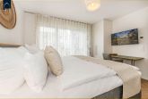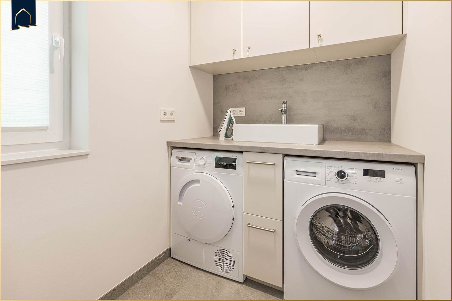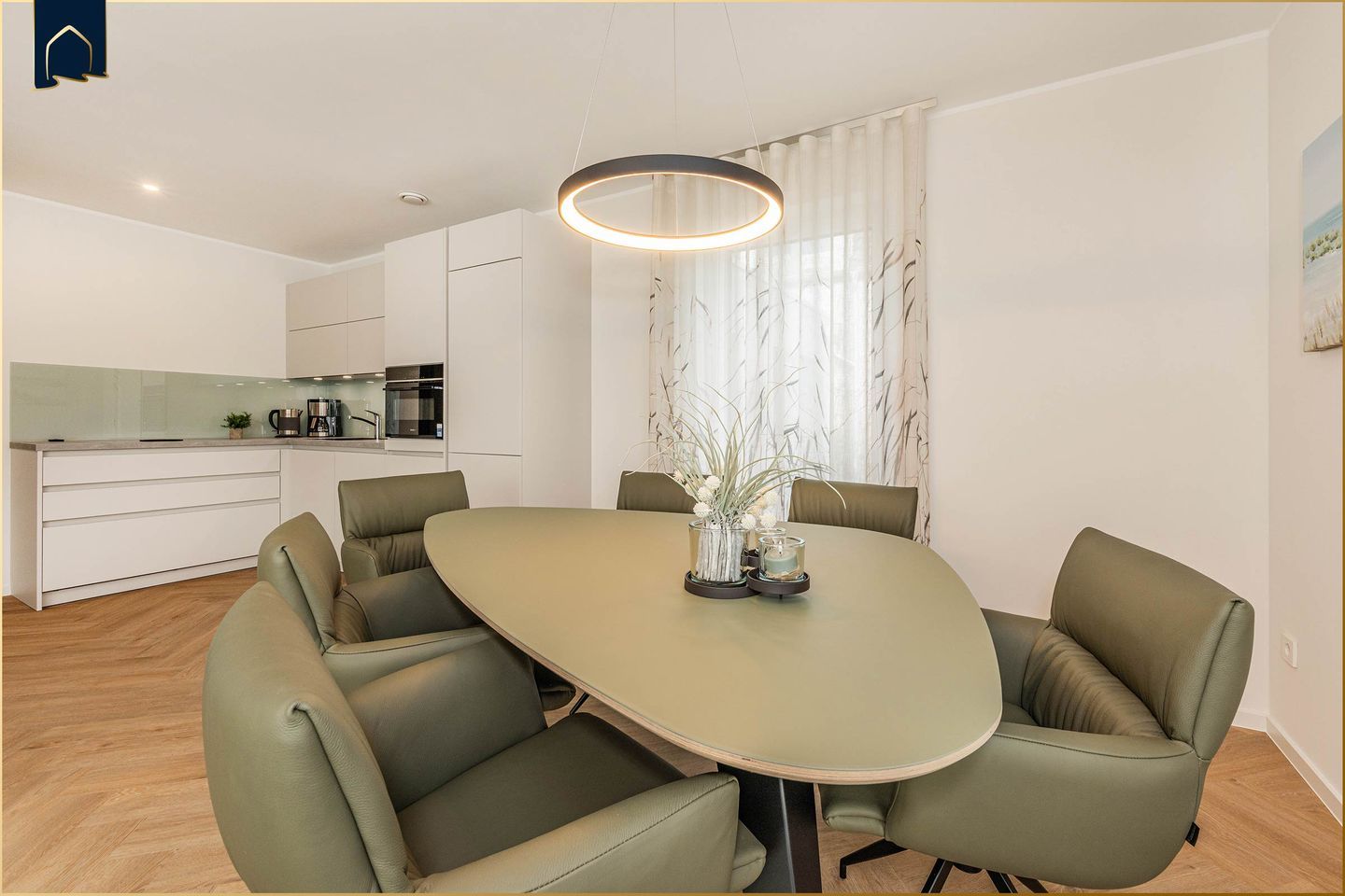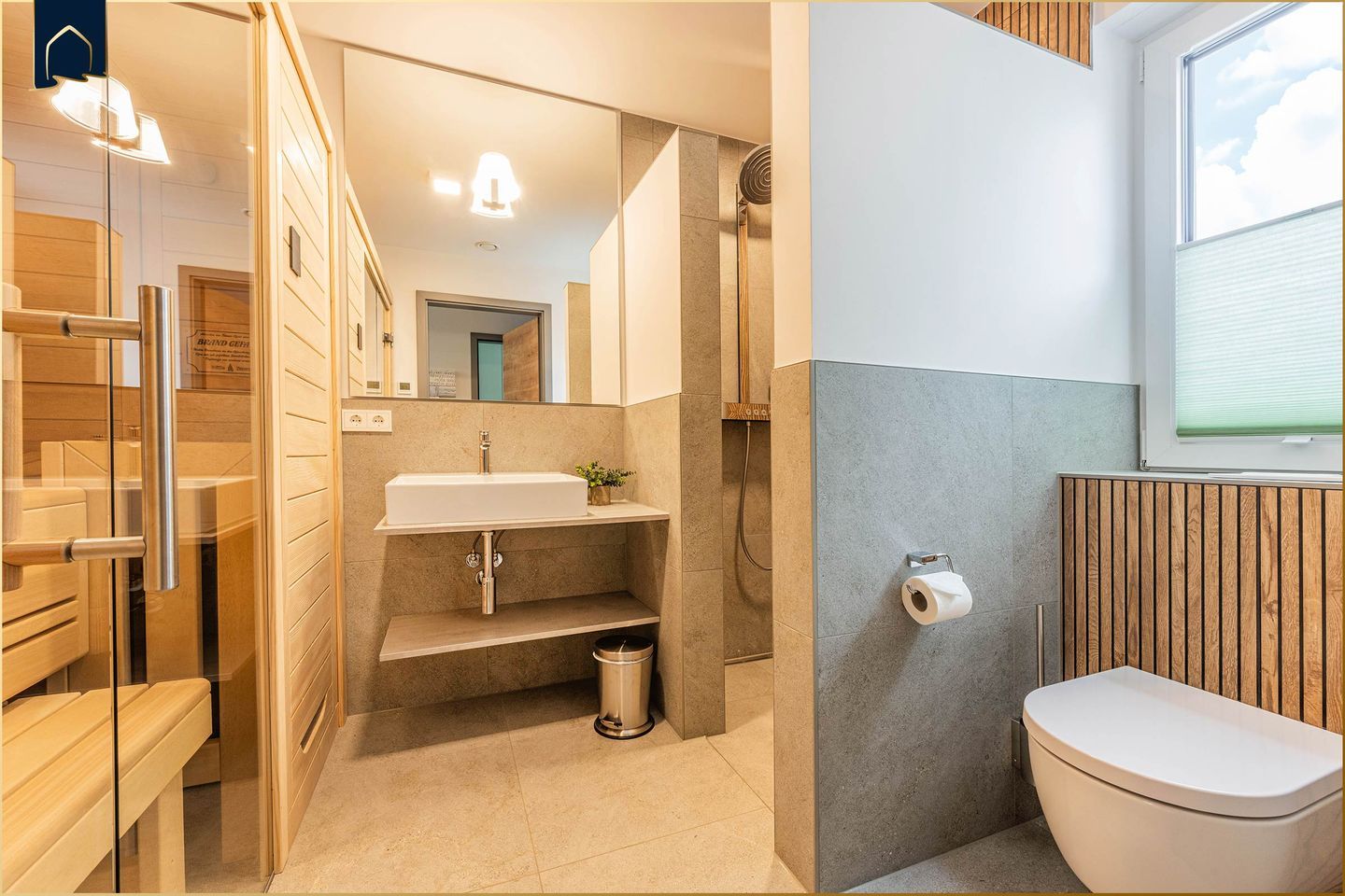 Die offene Wohnküche ist hochwertig ausgestattet mit Backofen, Herd, Spülmaschine, Mikrowelle, Toaster, Kaffeemaschine, Wasserkocher und vielem mehr – ideal für gemeinsame Kochabende. Der große Esstisch bietet Platz für alle Gäste. Ein besonderes Highlight ist die Fußbodenheizung, die für wohlige Wärme im gesamten Haus sorgt. Für Workation-Gäste steht ein Schreibtisch bereit, und dank schnellem WLAN sind Sie jederzeit bestens verbunden. Waschmaschine und Trockner stehen zur freien Nutzung zur Verfügung, ein Fahrradabstellraum ist ebenfalls vorhanden. Die Fenster sind komplett mit Sichtschutz versehen – für maximale Privatsphäre.