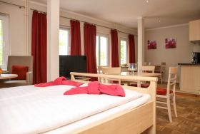 Unsere drei unterschiedlichen Ferienwohnungen in unterschiedlichen Größen bieten Platz für bis zu 13 Personen. Jede Unterkunft verfügt über mindestens ein Doppelbett, eine Pantry-Küche und ein Badezimmer mit Dusche. Zusätzlich haben Sie entweder Zugang zu einem Balkon, oder zu einer Terrasse. Auch Haustiere heißen wir hier herzlich willkommen.
